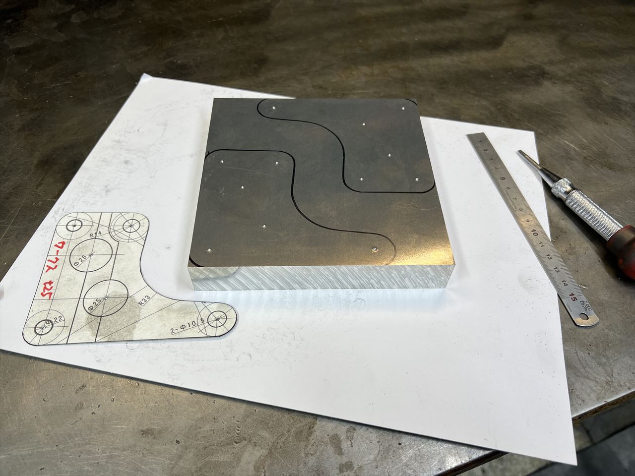 製作するサポート形状はワークスタイプです。25ミリのジュラルミン板から切り出します。S1も1000Jフォーク形状なので、1000Jフォークベースがいちばん近い形になりますね。