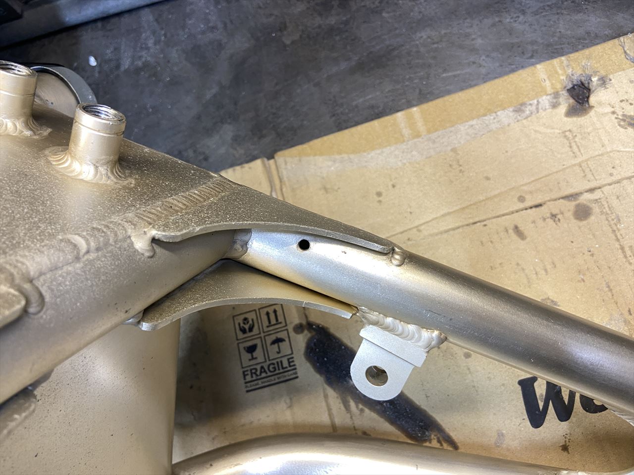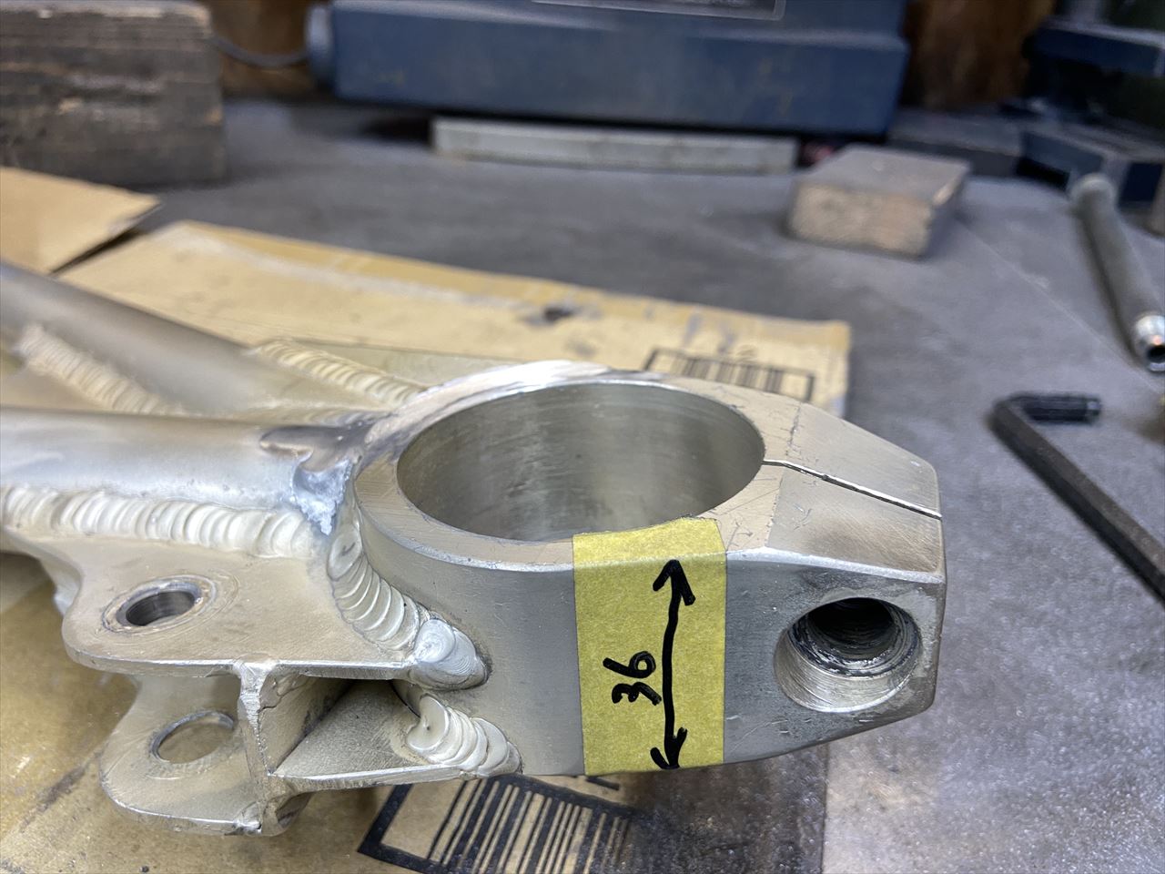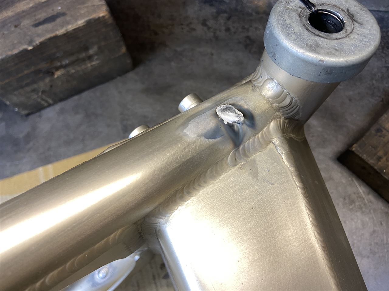 こちらはエキセンハウジングが交換されていたり、再度アルマイトを施工してあったりといろいろ履歴があるとのこと。再アルマイトの際に追加で開けられたであろう3ミリくらいの穴が多数開いており、気になるとのことで溶接で塞ぐことに。