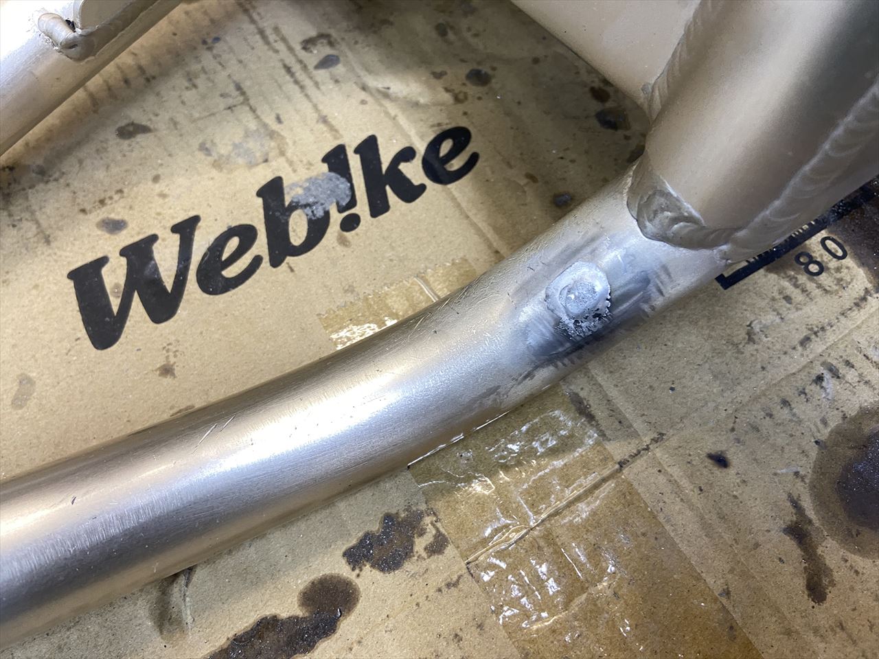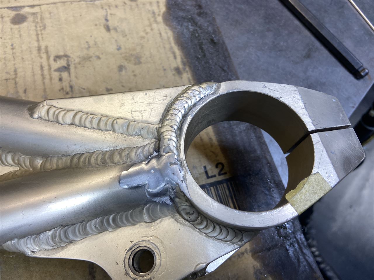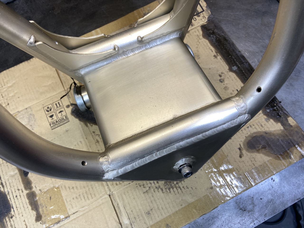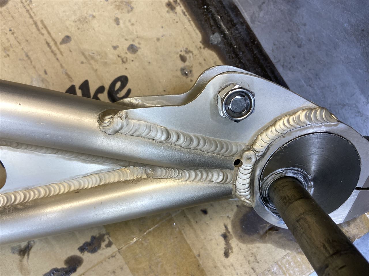 エキセンハウジングの内側。このように溶接ビードが出っ張っていると、ホイールカラーと干渉し易いので修正しておきます。