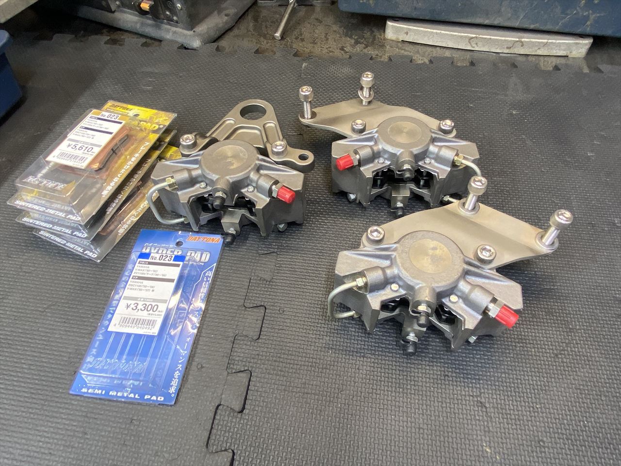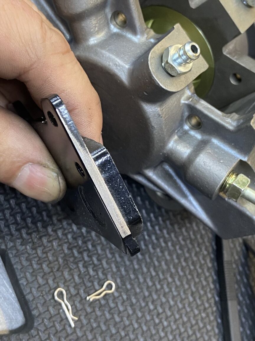 パッドを組み付けるとこんな感じ。ベータピンの脱着はかなりやり難いので、車両取り付け前に練習しておくことをお勧めします。