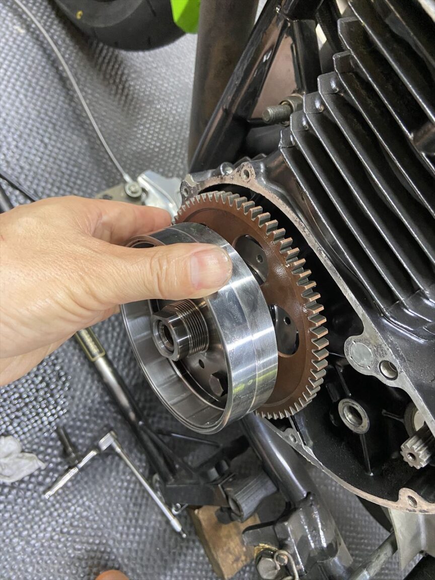 薄型のジェネレーターローターが付きました。磁石はネオジムで強力なので、かなり薄く小型化されています。軽量なのでエンジンのピックアップも良くなります。