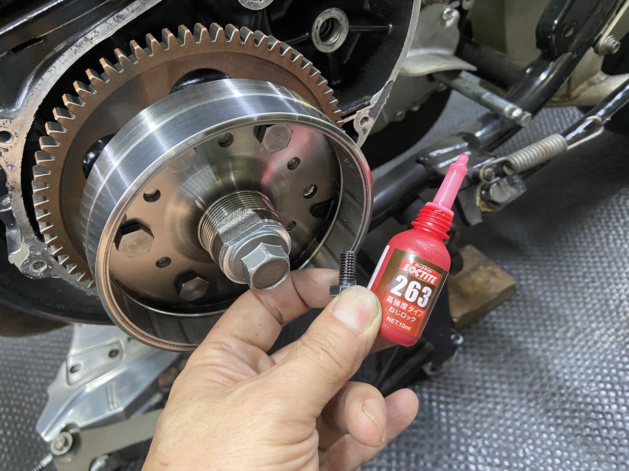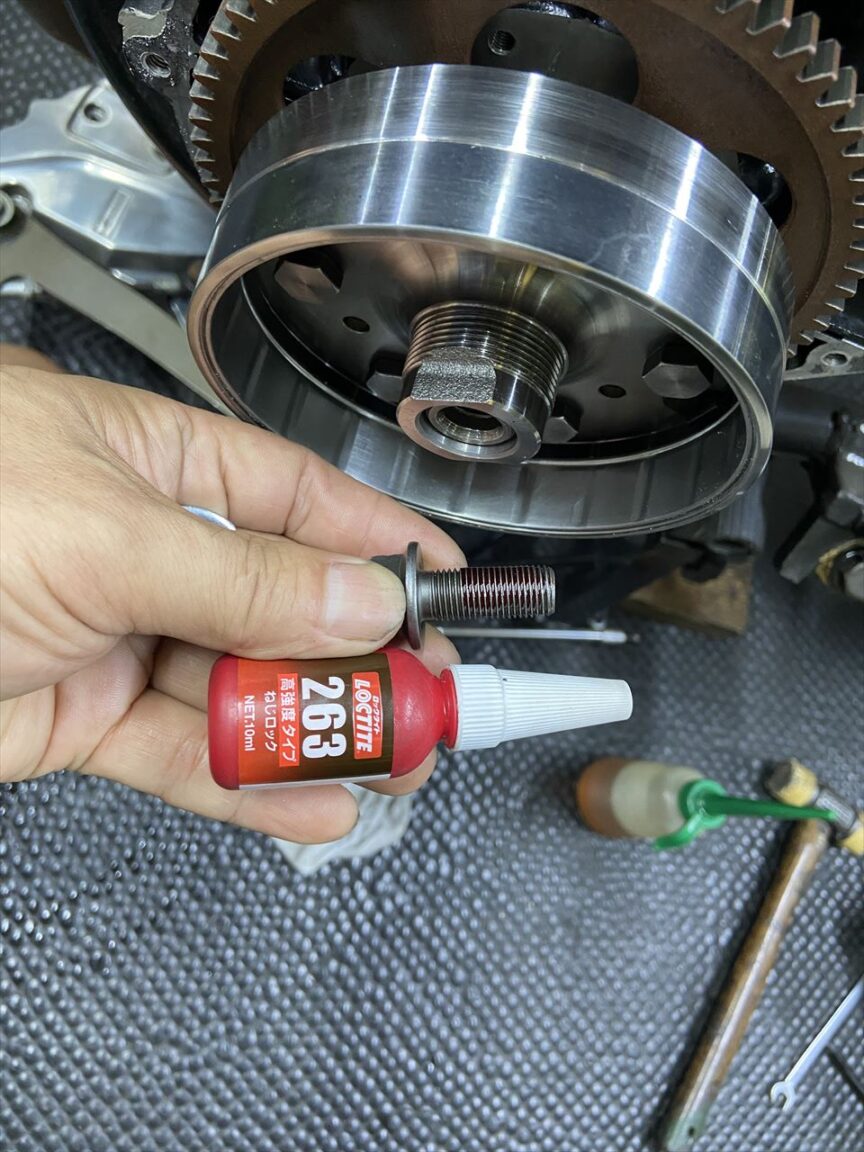 スタータークラッチのボルトは仮止めなので、ネジロックを塗布して規定トルクで締め付けます。