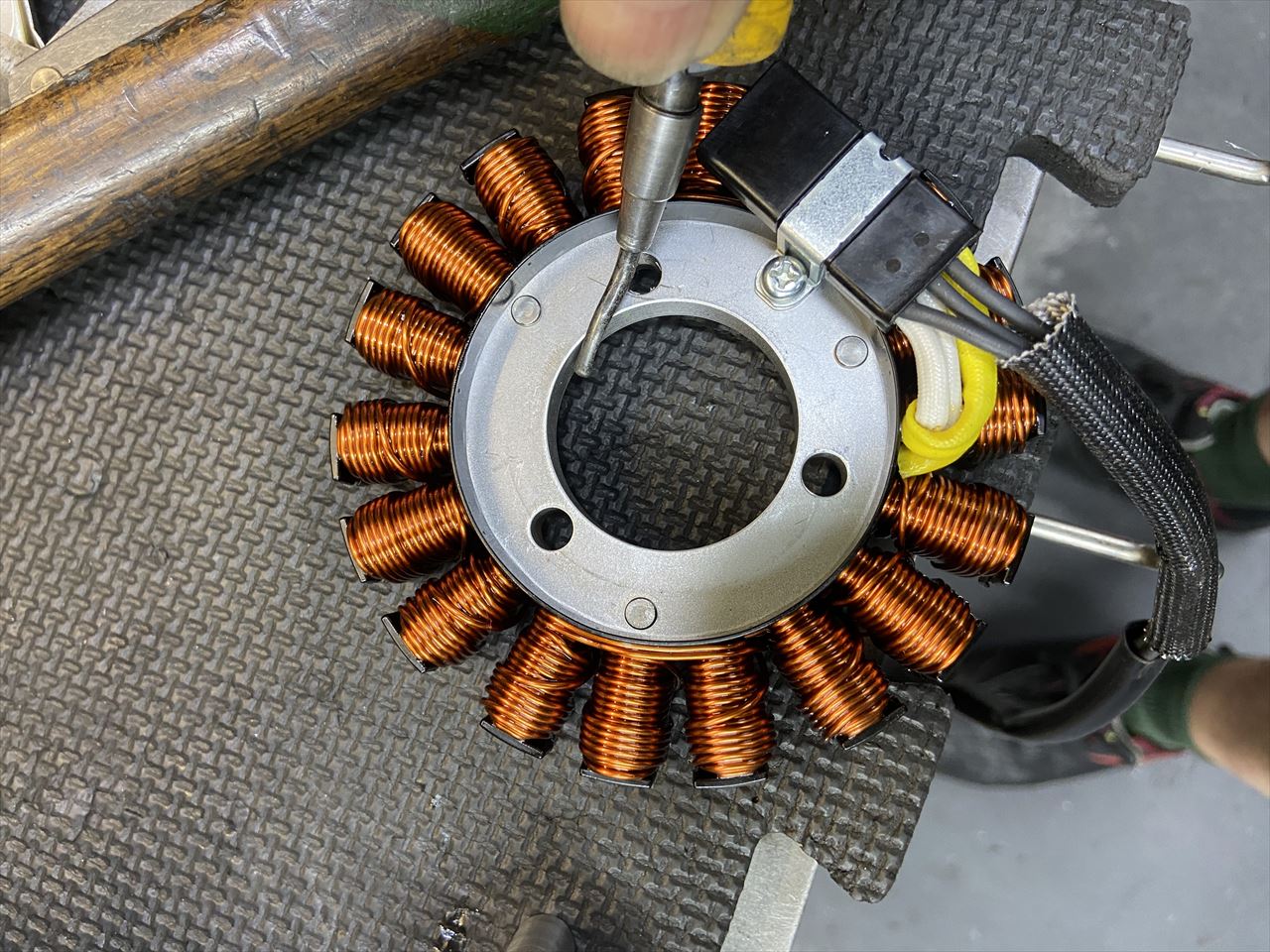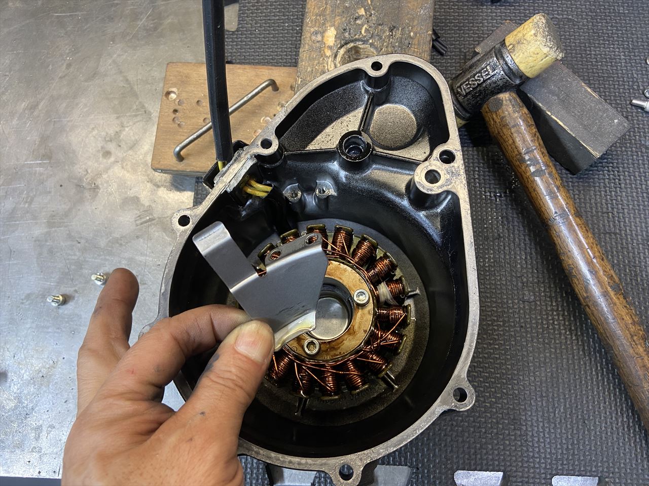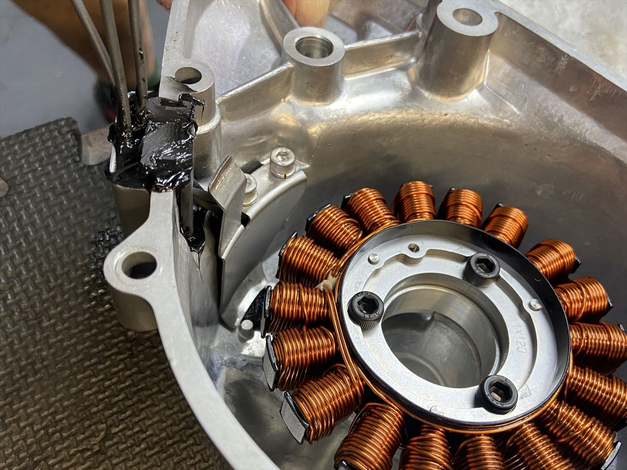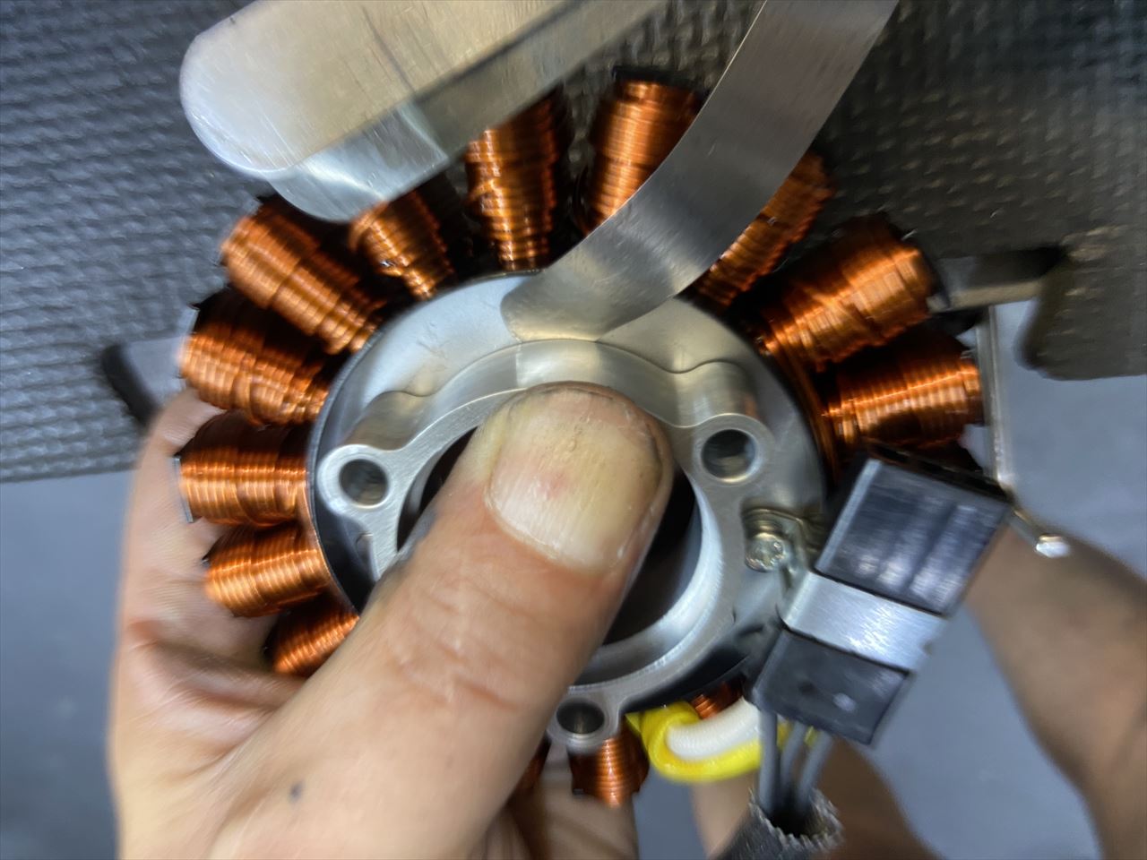 ステーターコイルを取り付け、ハーネスガイドも取り付けます。ガイドの奥側は突起に引っかかるようにしておくといいです。