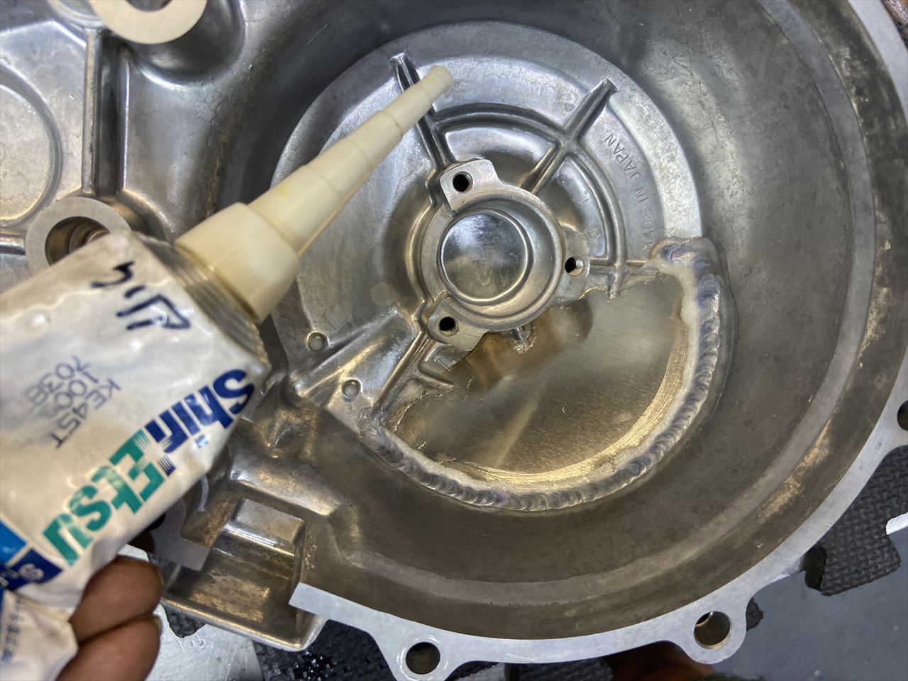 カットカバーの溶接部には、オイル滲みしないよう念のためシリコンボンドを塗っておきます。
