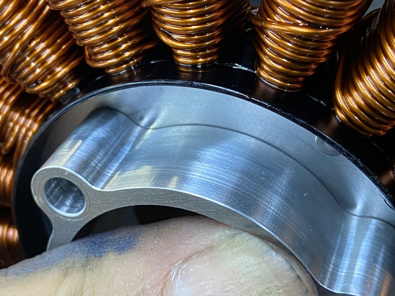 ステーターコイルはここを確認します。アダプターの隅に逃げ加工が無いのでこのまま締め付けても密着しません。使用中に緩んでくる原因ともなるので改修します。
