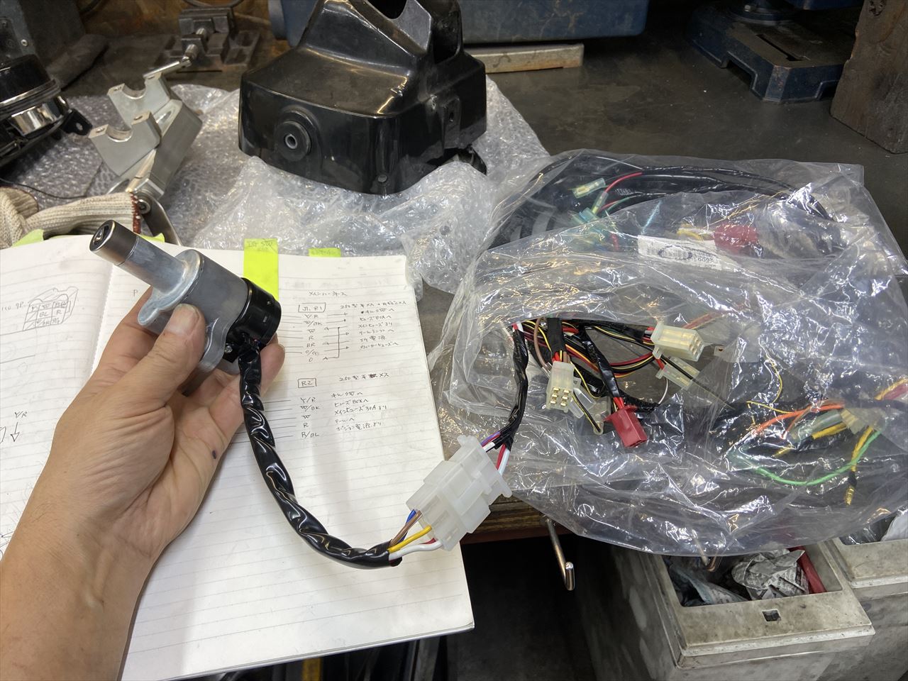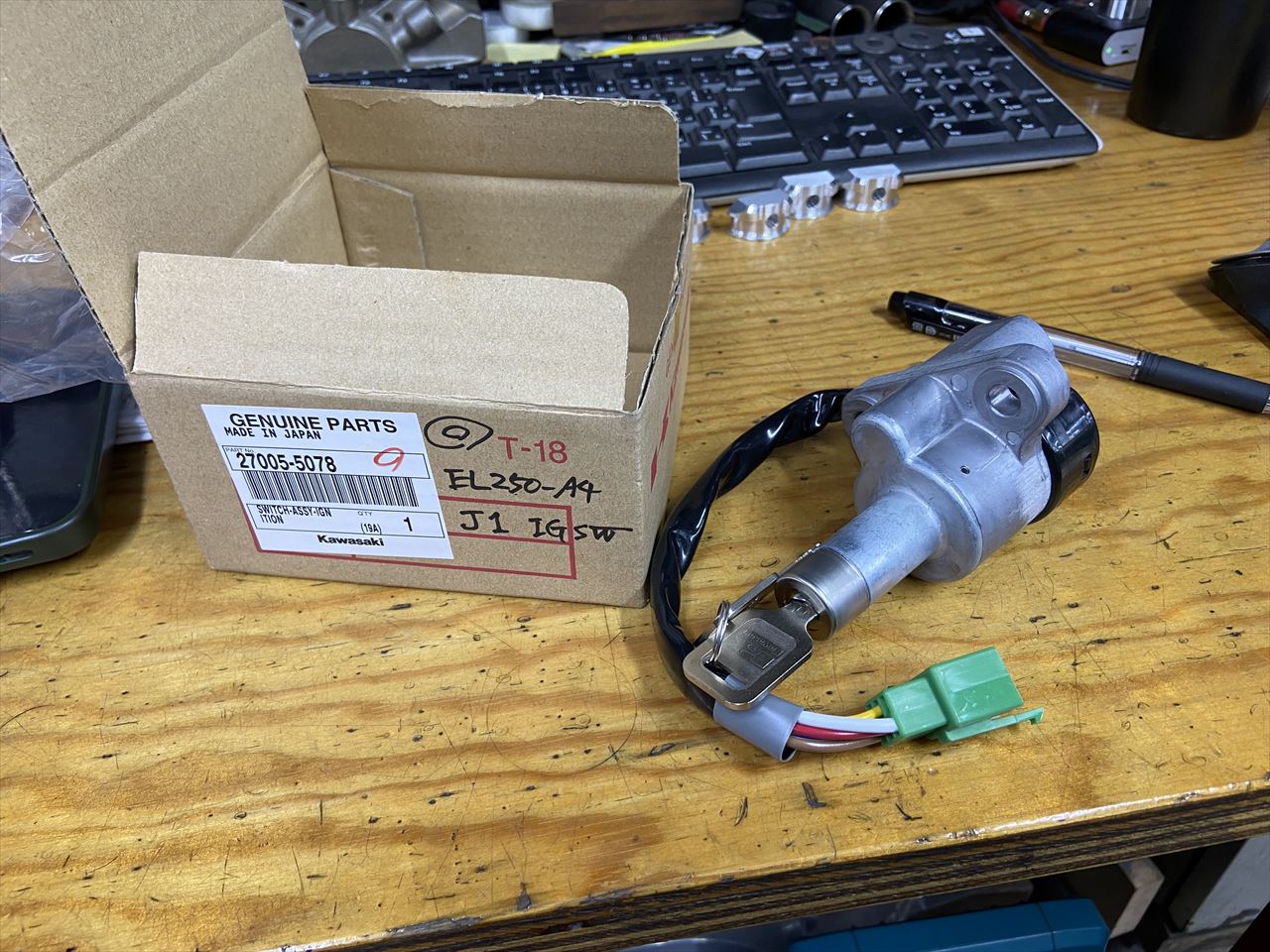 イグニッションスイッチは取り付けに互換性のあるエリミネーター250の純正を使います。同様のイグニッションスイッチはエリミ用で数種類ありますが、こちらのEL250-A4タイプが配線加工がし易いのでお勧め。メーカー在庫は残り少ないようです。部品番号は 27005-5078 です。