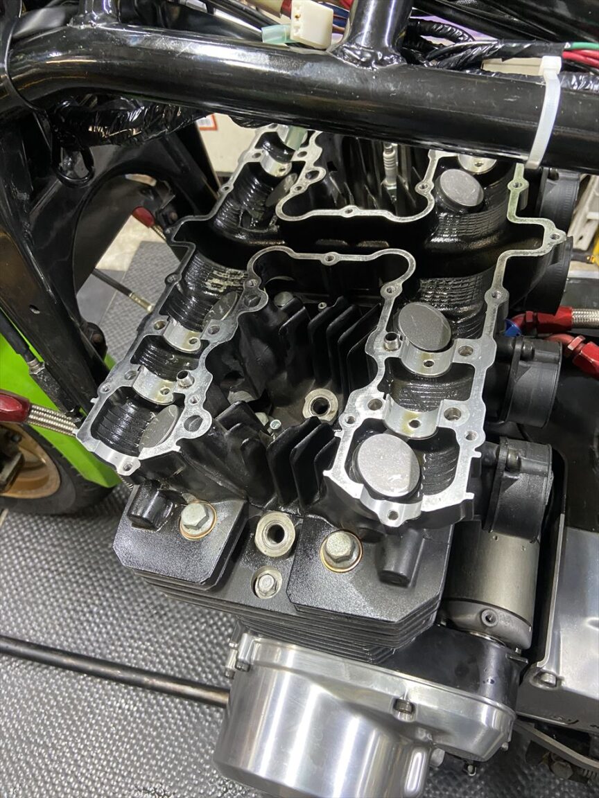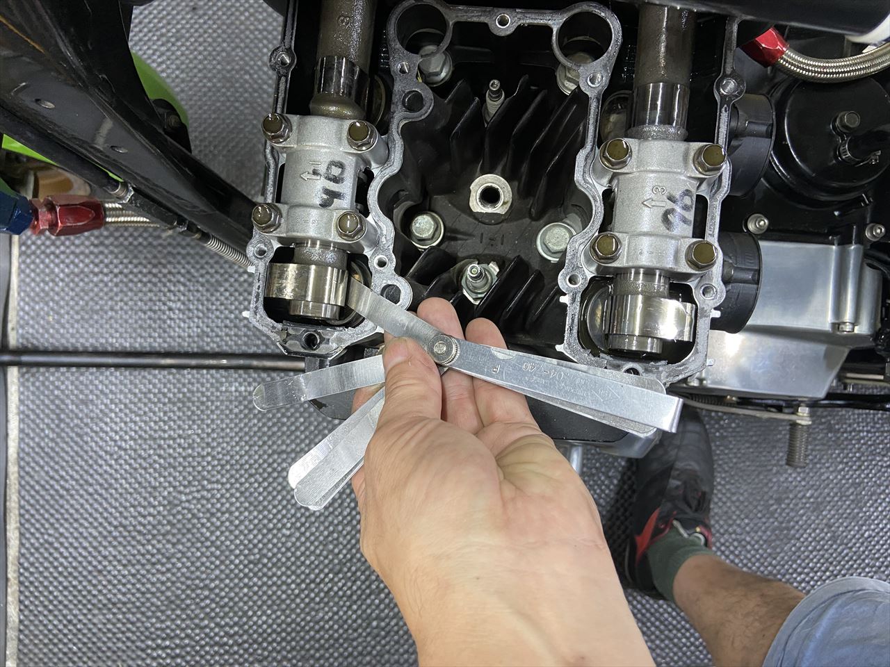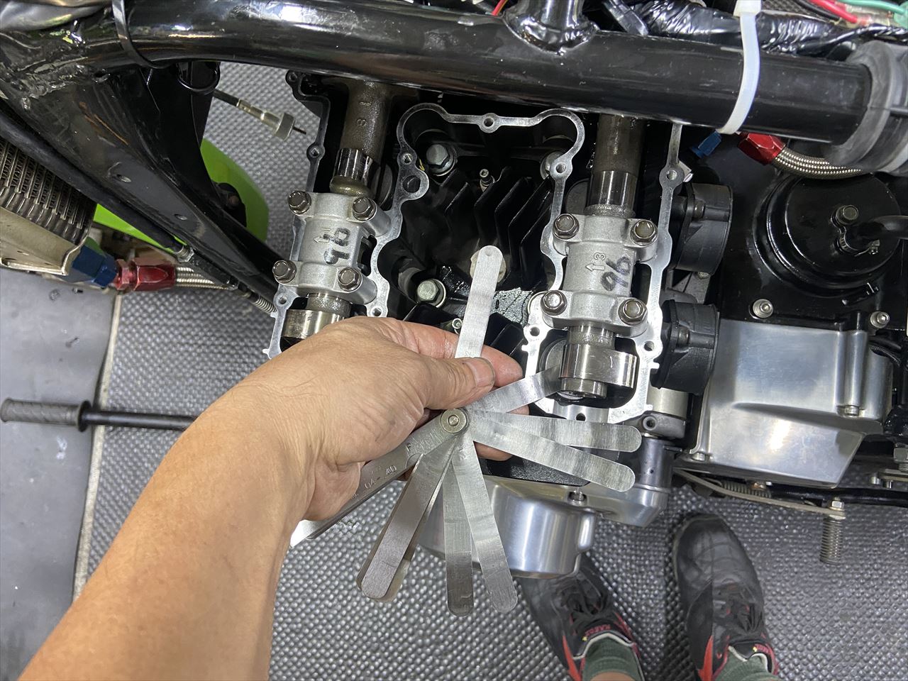 ヘッドカバーを外し、バルブクリアランスを計測。やや狭いところがいくつかありますね。