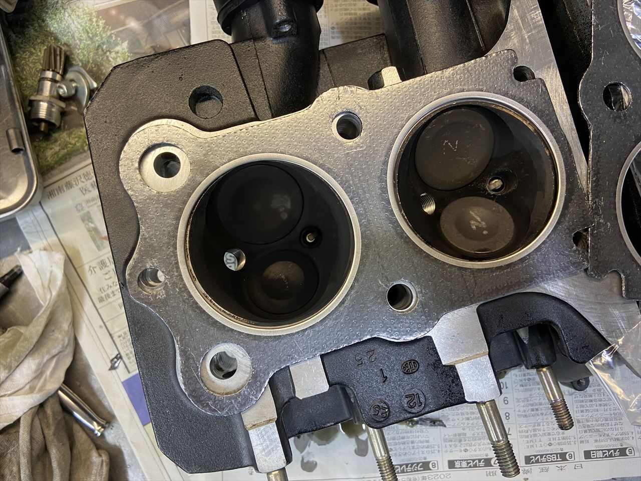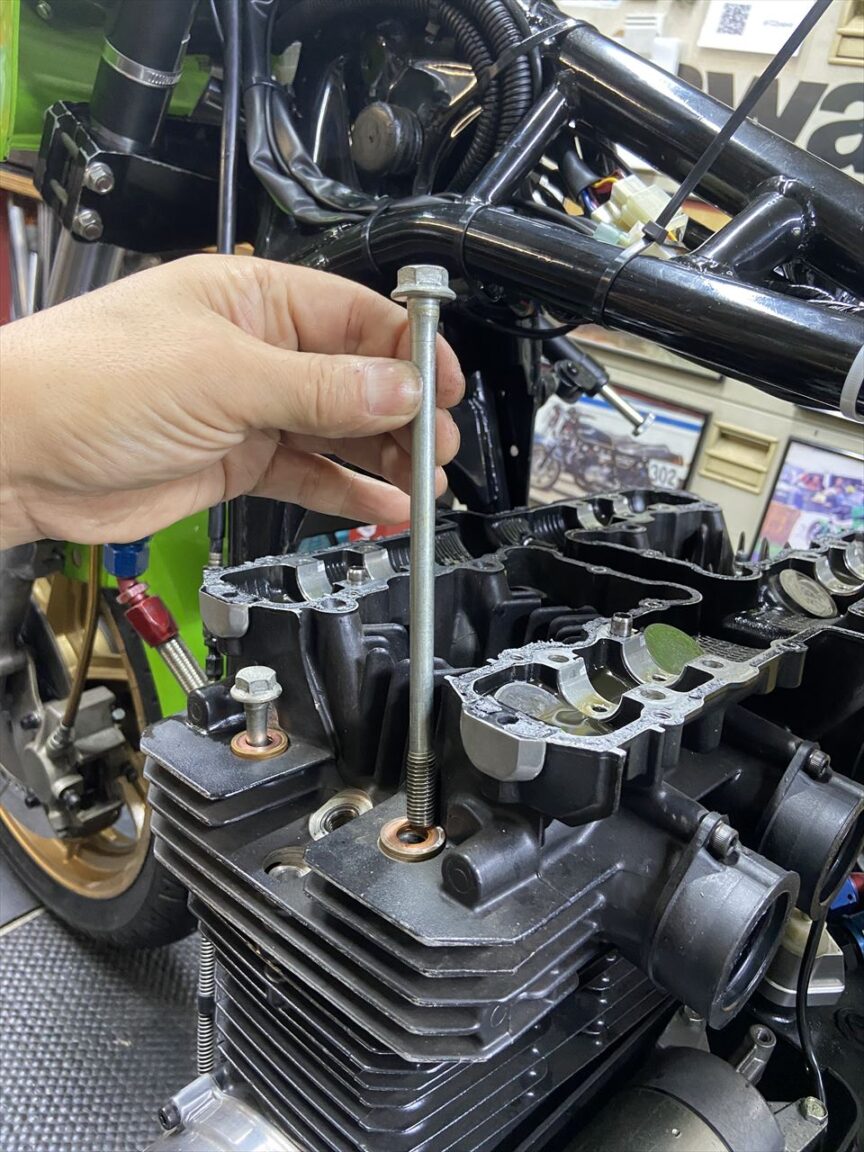 ヘッドとシリンダーを止めるボルトはスタッドではなくボルトで止まっています。なぜか全ヵ所ワッシャーが2枚ずつ入っていますね。
