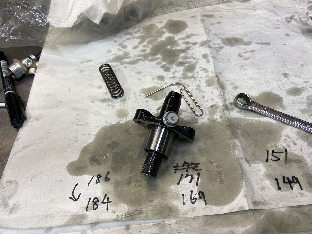 テンショナーはリターンスプリングが強化品で密着長が長いためうまく組み込めません。代わりに純正のリターンスプリングに交換して組み付けます。