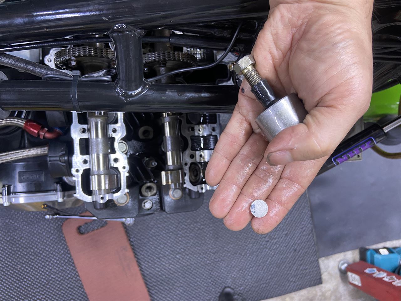 バルブクリアランスを調整するため、カムを外してシム交換します。