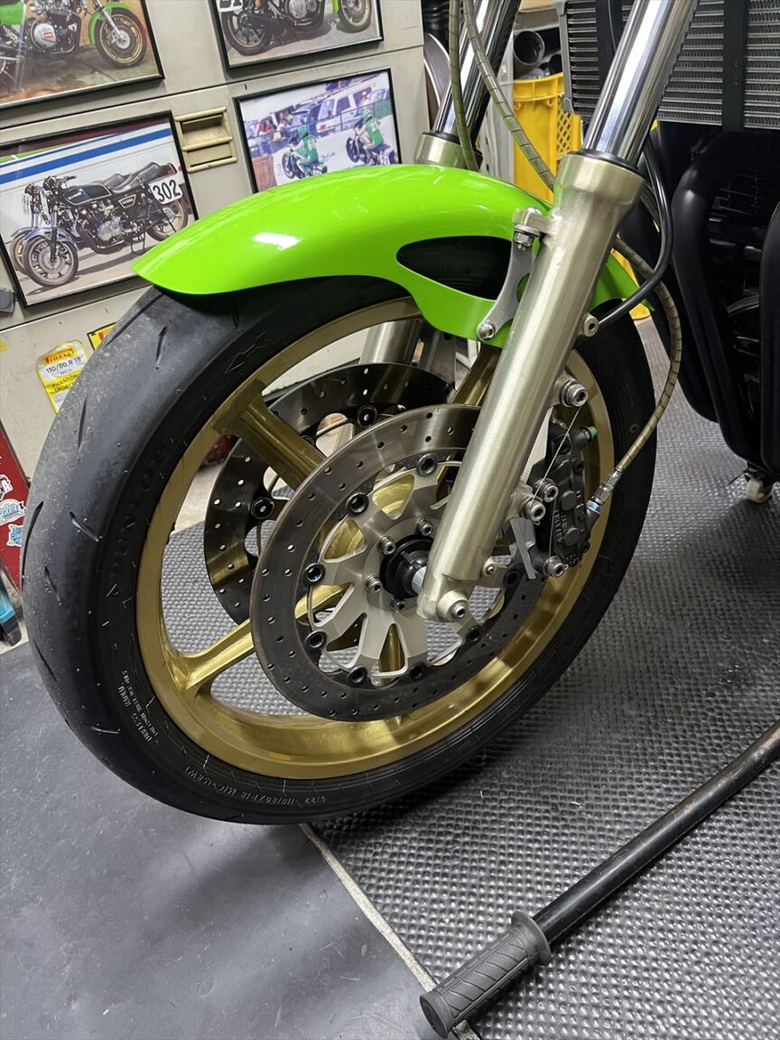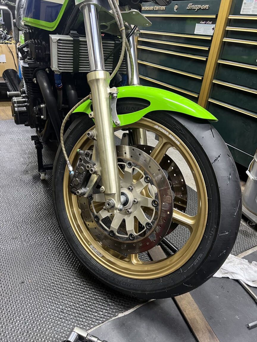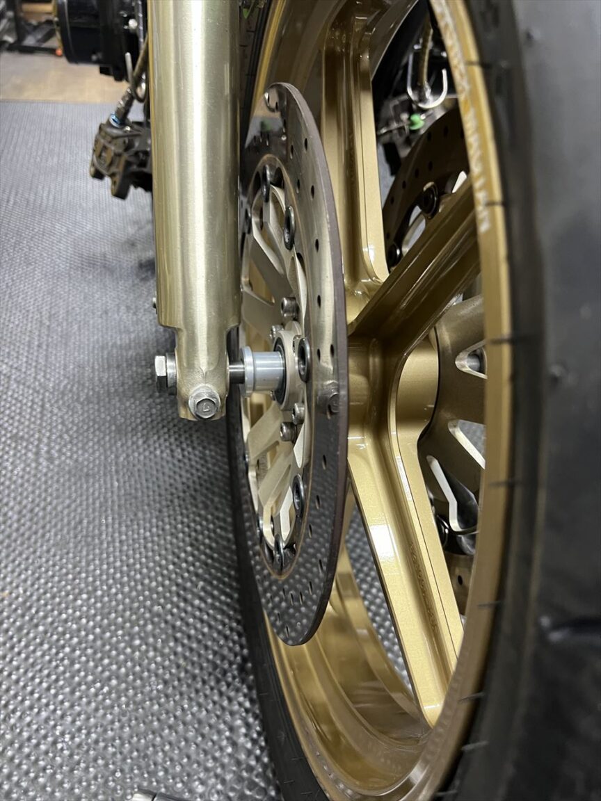 キャリパー周りはそのまま適合。フロントホイールは交換終了です。