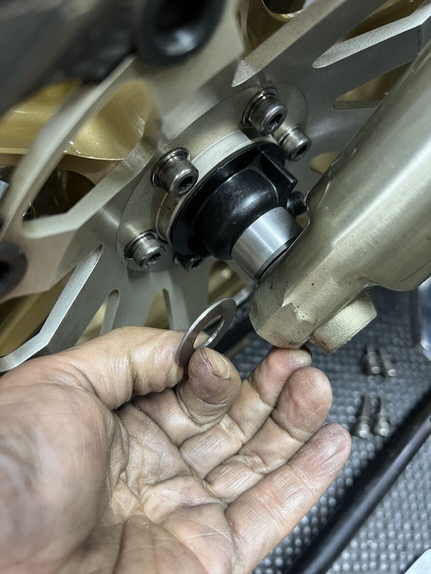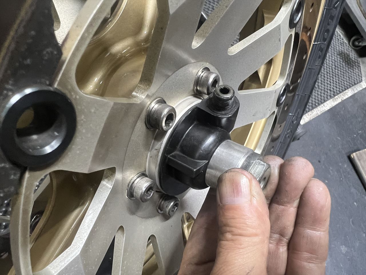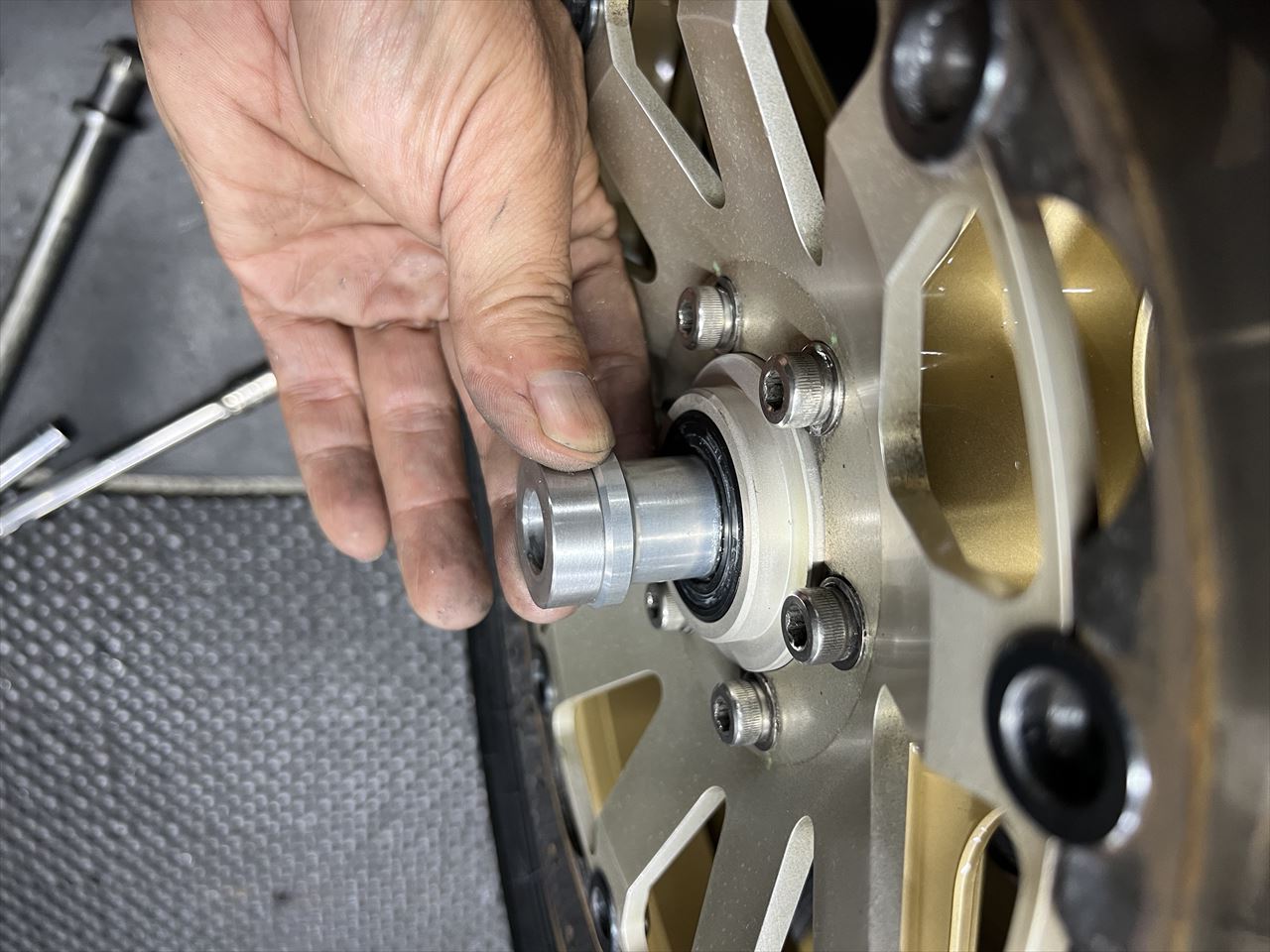 キャリパー周りはそのまま適合。フロントホイールは交換終了です。