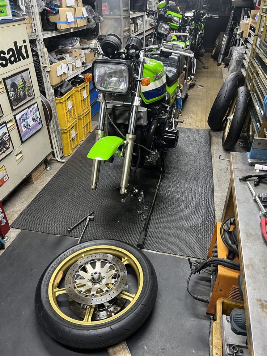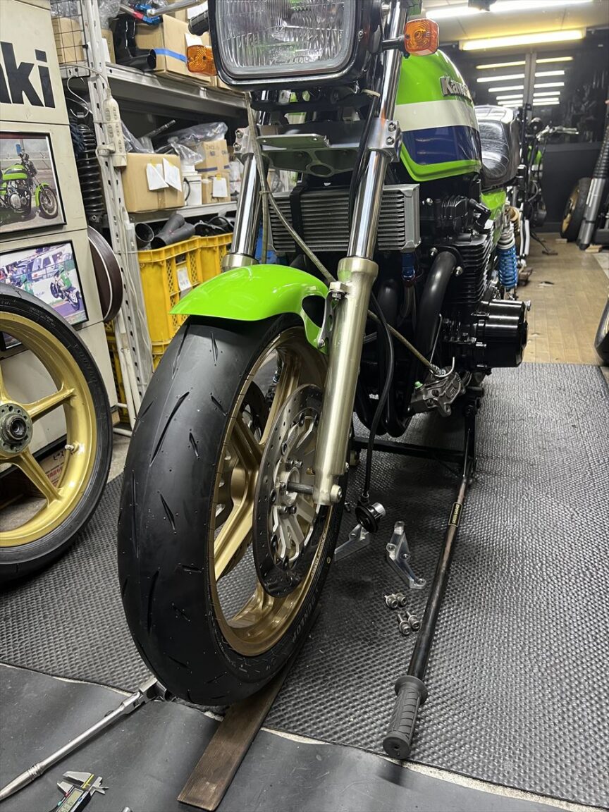 先ずはフロントから。現状はビートマグです。フォークはFZR750とのこと。