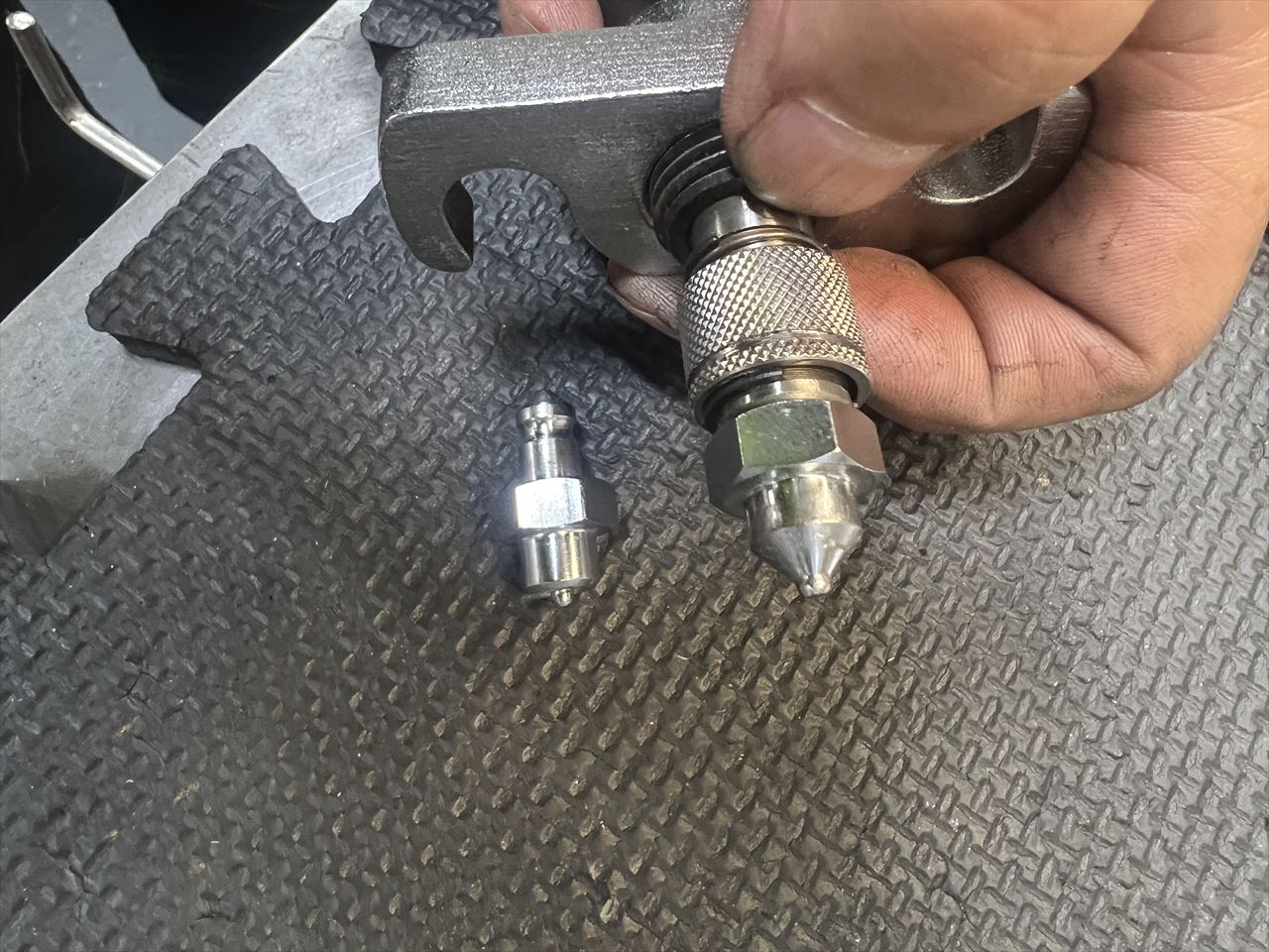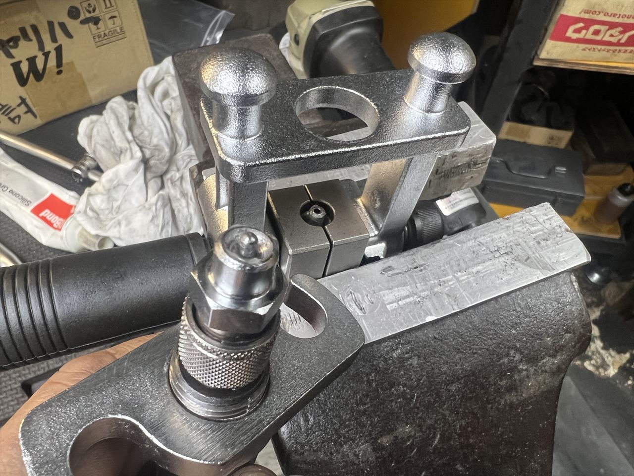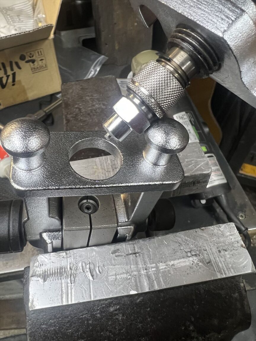 端部はダブルフレアとするので、治具にセットして加工します。1回目のダイスはこんな形状です。