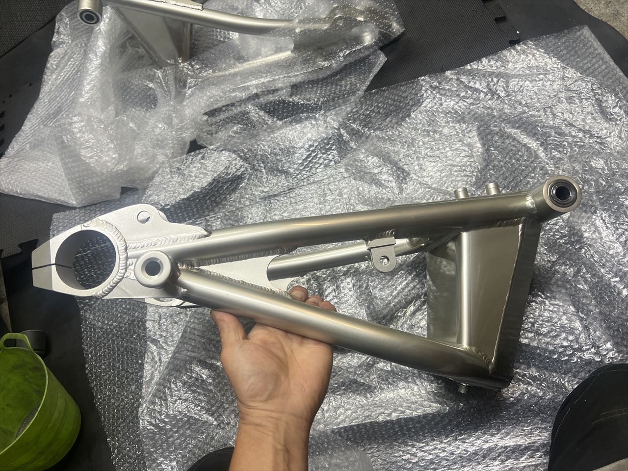 こちらがお持ち込み入庫時の状態で、実車フルコピータイプの中古S1スイングアームでしたが、使用に伴うキズや再アルマイト時にあけたであろう水抜き穴が多数ある状態です。