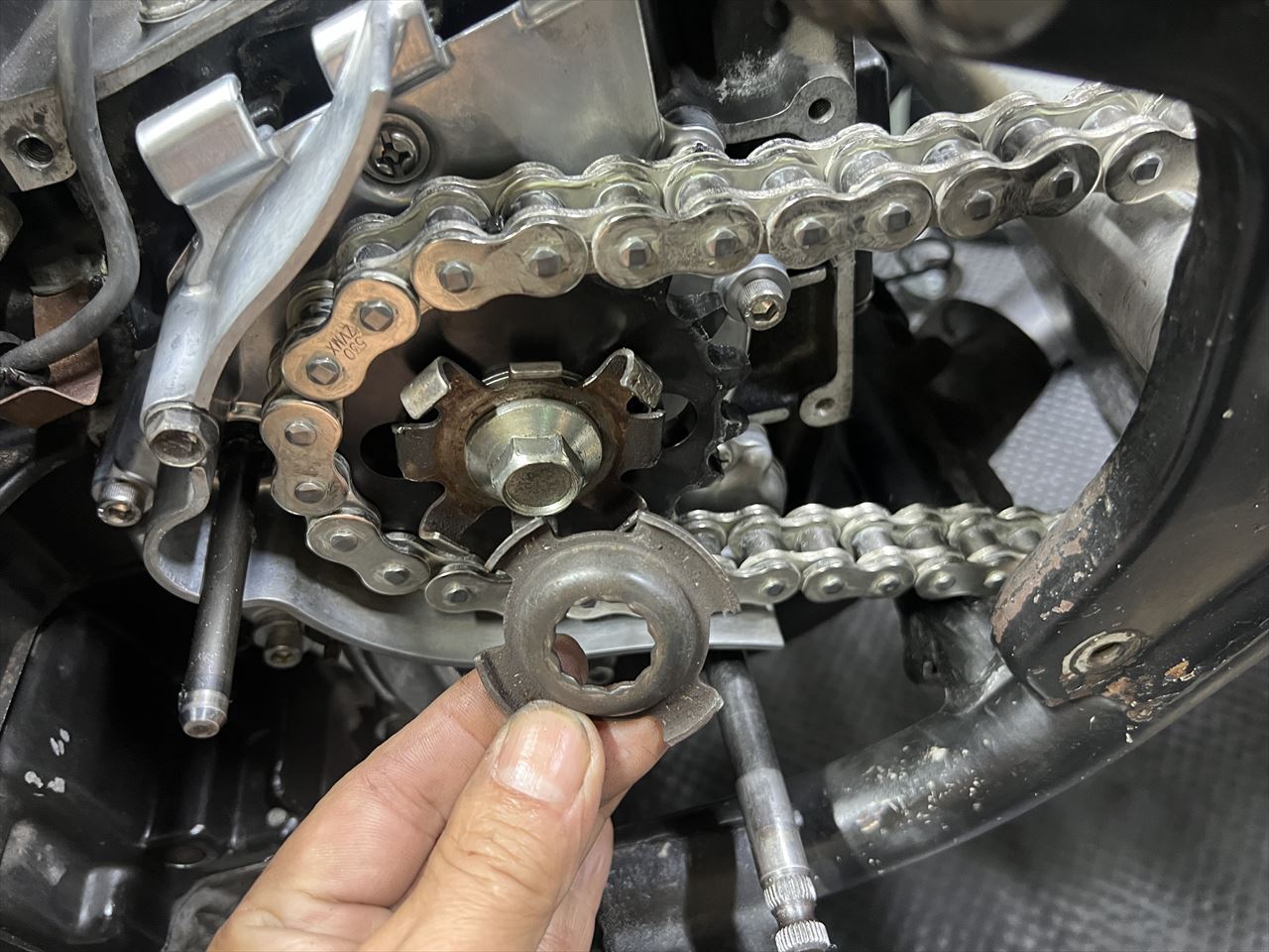 フロントスプロケの固定は手持ちの中古純正ロックワッシャー一式を使用。