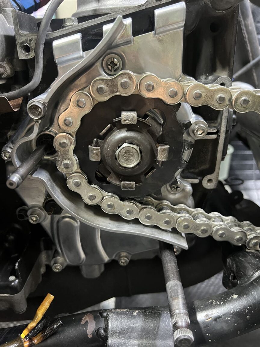 530チェーンと前後スプロケ取り付け完了です。ギヤ比は18×45T、チェーンのリンク数は116Lです。