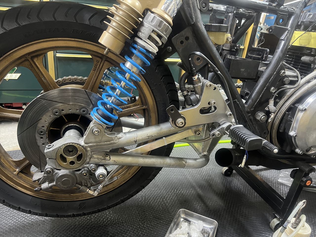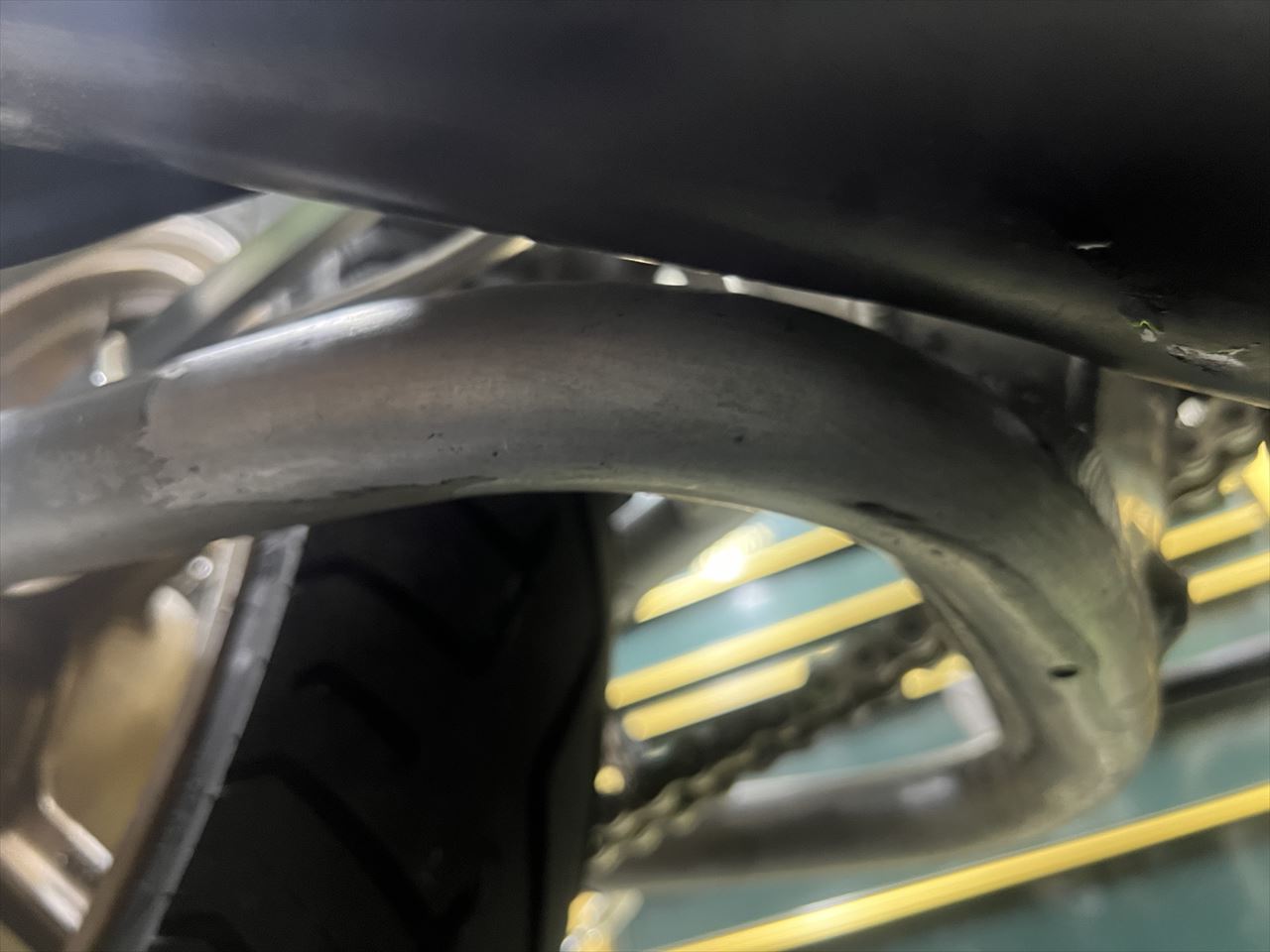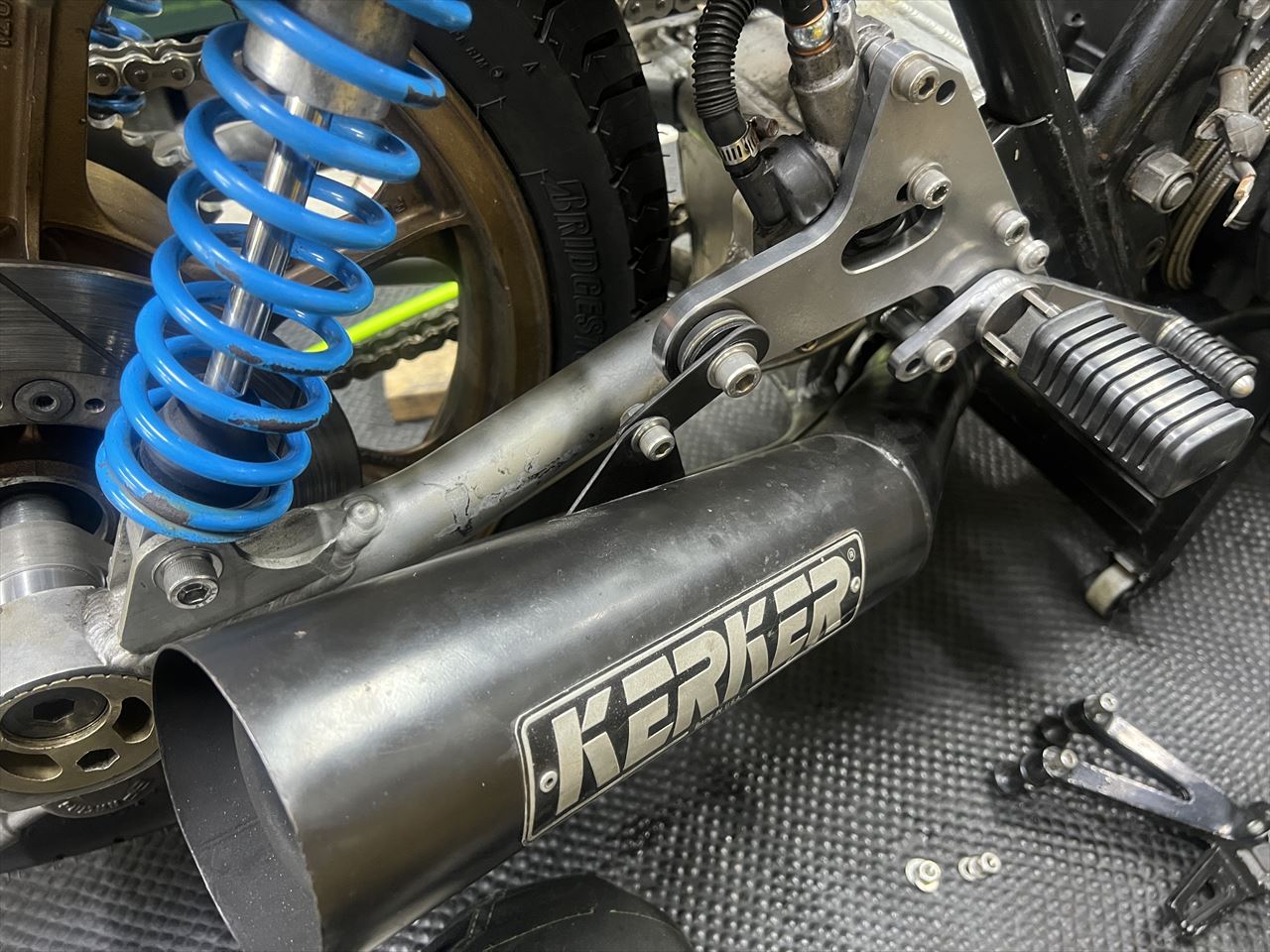サイレンサーはステーを外側に配置することでスイングアームとの干渉を避けられました。