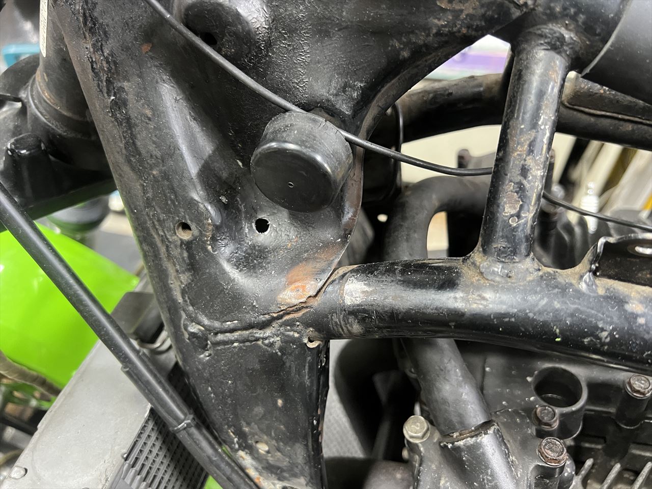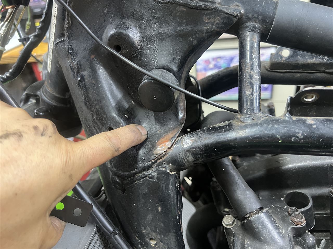ホーンは純正が2個付いていましたが変更します。よくやる方法としてガセットのここに6ミリの穴を開け、裏側のデッドスペースに移設します。