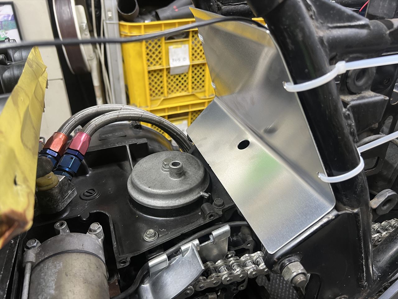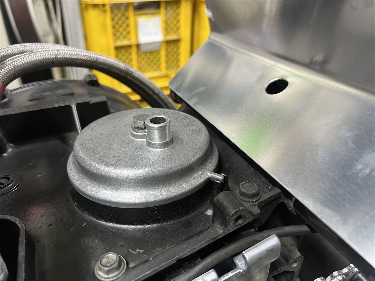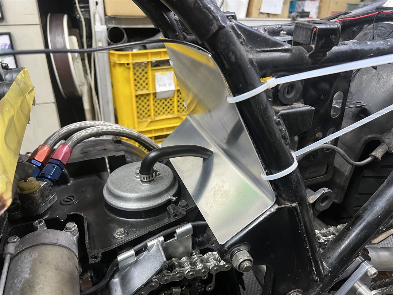 キャブはCR33に変更するので後方に隔壁を追加します。ブリーザーホースの差し込みは抜け止めが無いので加工します。