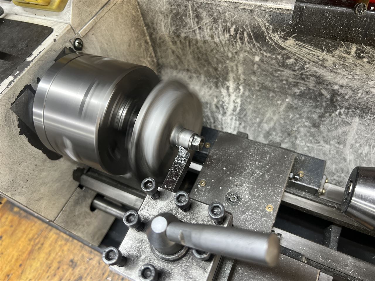 純正のブリーザーカバーを治具にくわえて旋盤で段付き加工します。