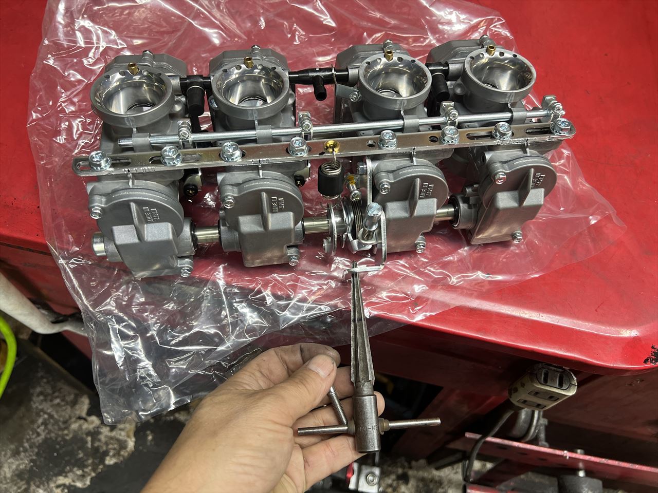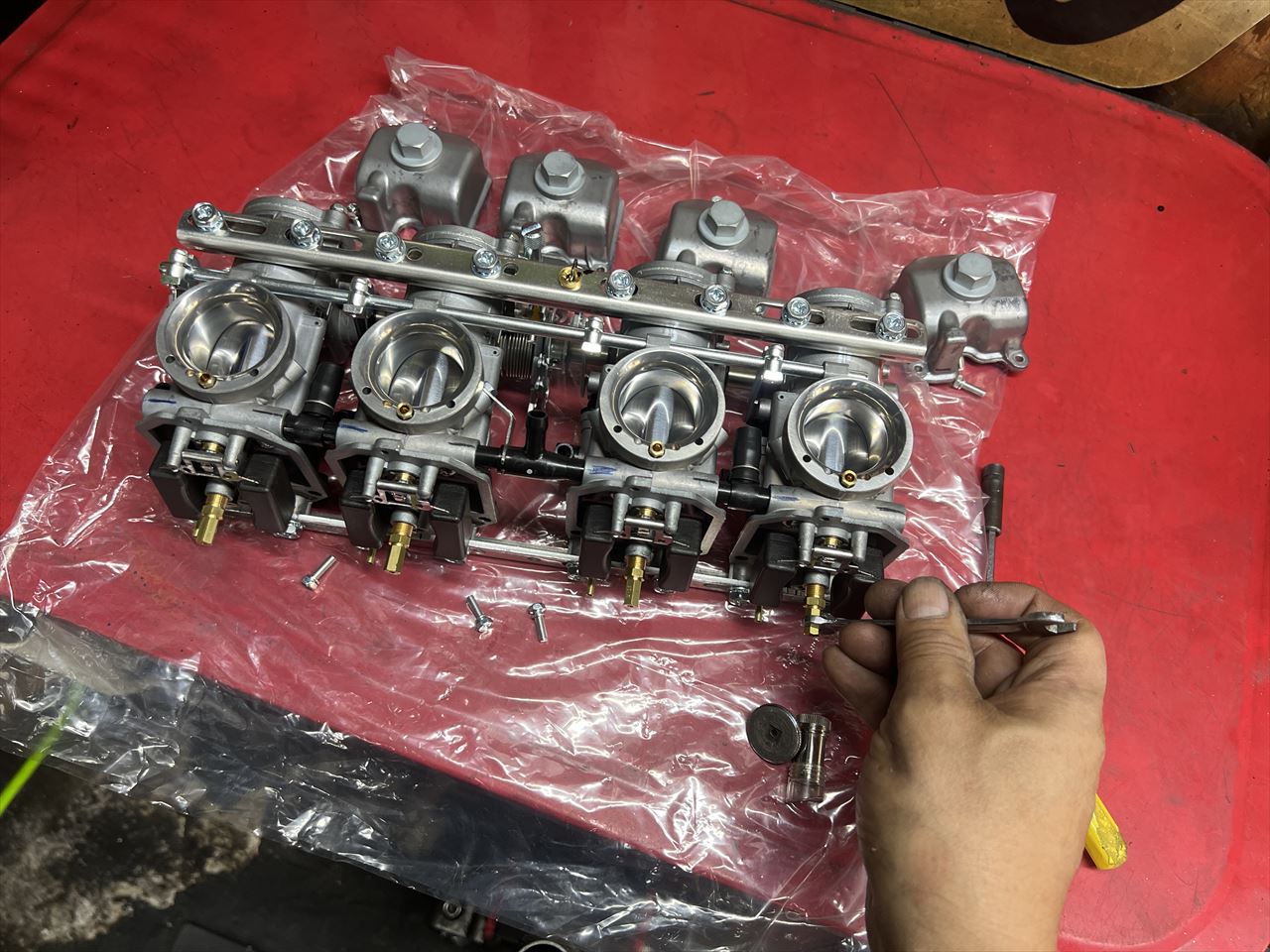初期のジェッティングを確認しておきます。メインジェットは一旦緩めておくと、セッティング作業中にホルダーが外れてこなくなり脱着がやり易くなります。