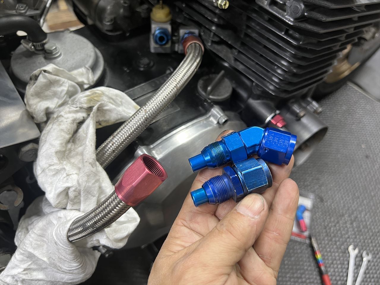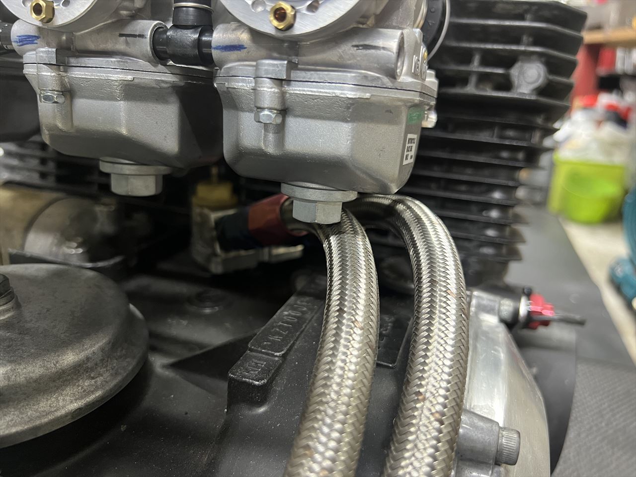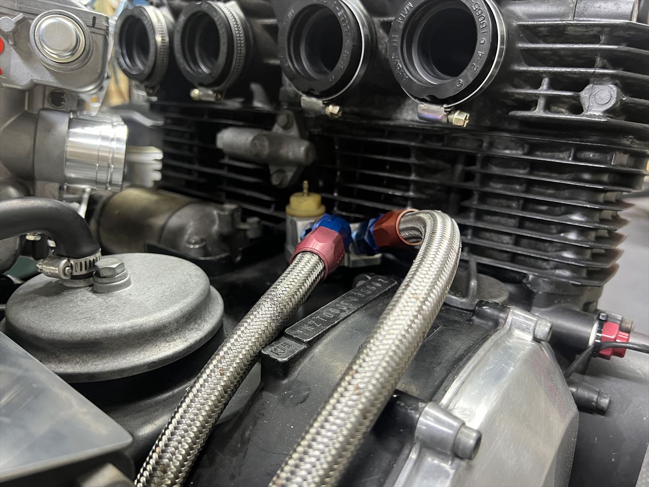 CRキャブを取り付けると既存のオイルクーラーホースと干渉するので修正します。