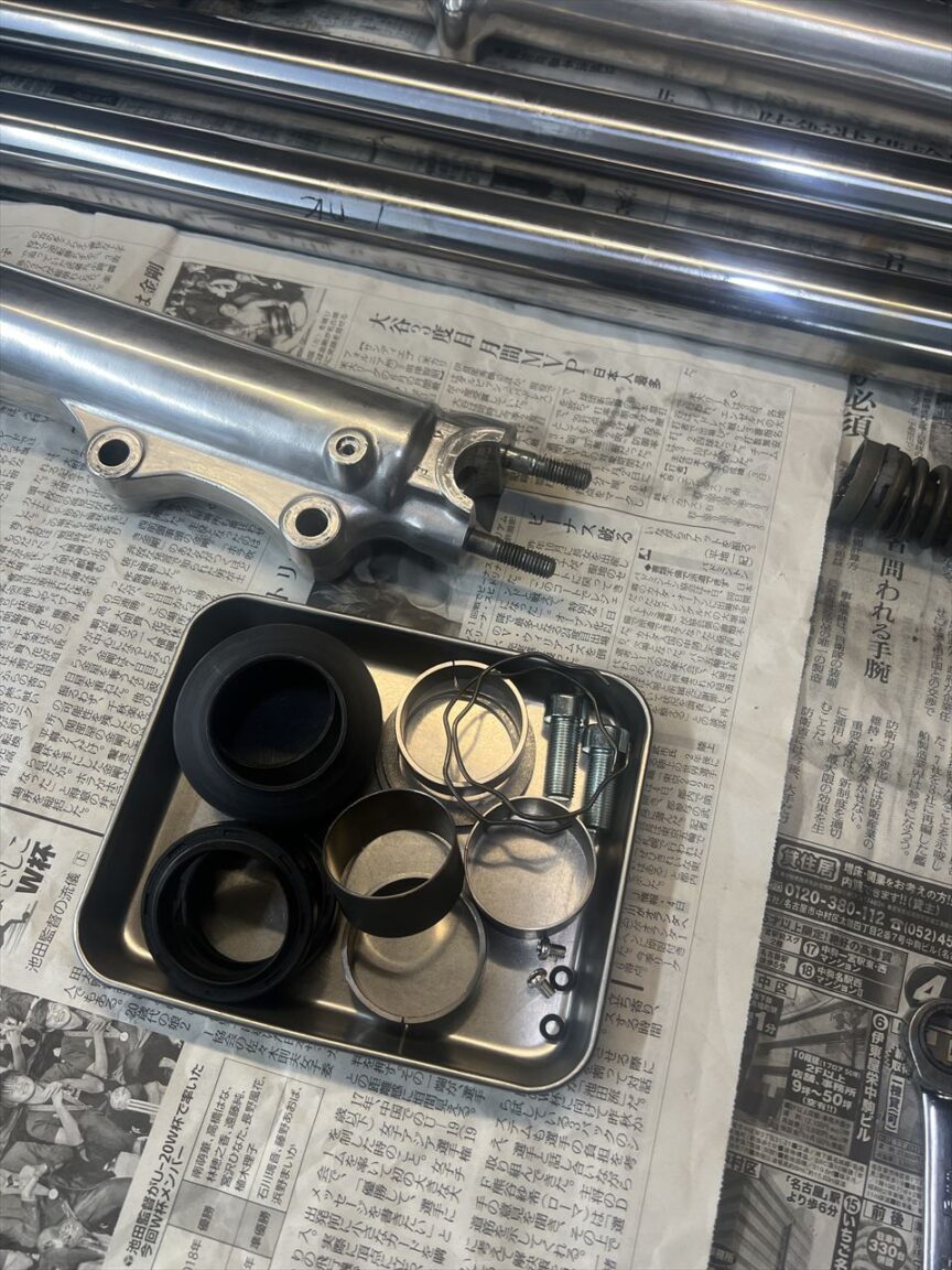 フォーク組み立ての続きです。消耗品は全て交換します。今のところ純正部品は揃いますが、ブッシュの片方はもうじき生産終了のようです。カワサキのHPで部品注文のページから部品番号で検索すると在庫状況がわかるのですが、最近は「在庫僅少」という記載をよく目にします。あくまで在庫が残りわずかということでしょうが、旧車の部品の場合は在庫が無くなり次第販売終了となることが多いです。今回もこれを見て10個追加で注文しておきました。まだあると思っていた部品が無くなってしまうと一気に焦るものです。