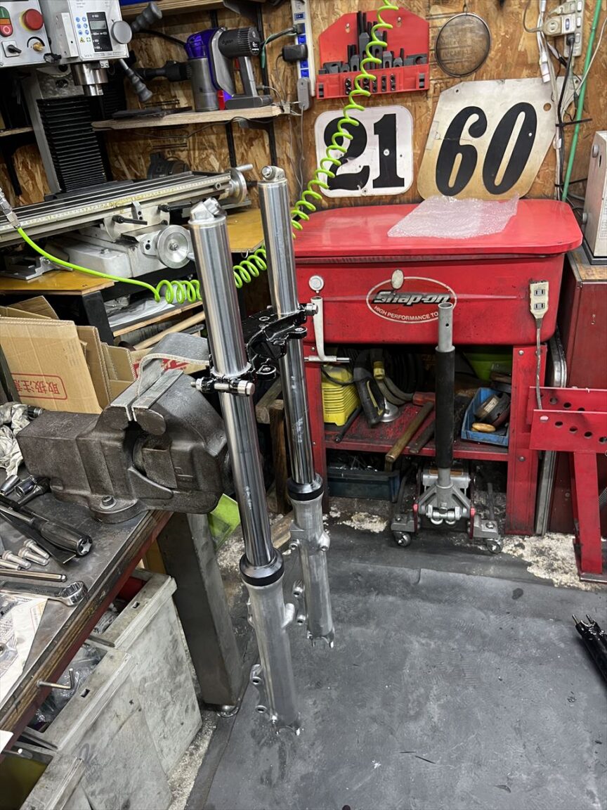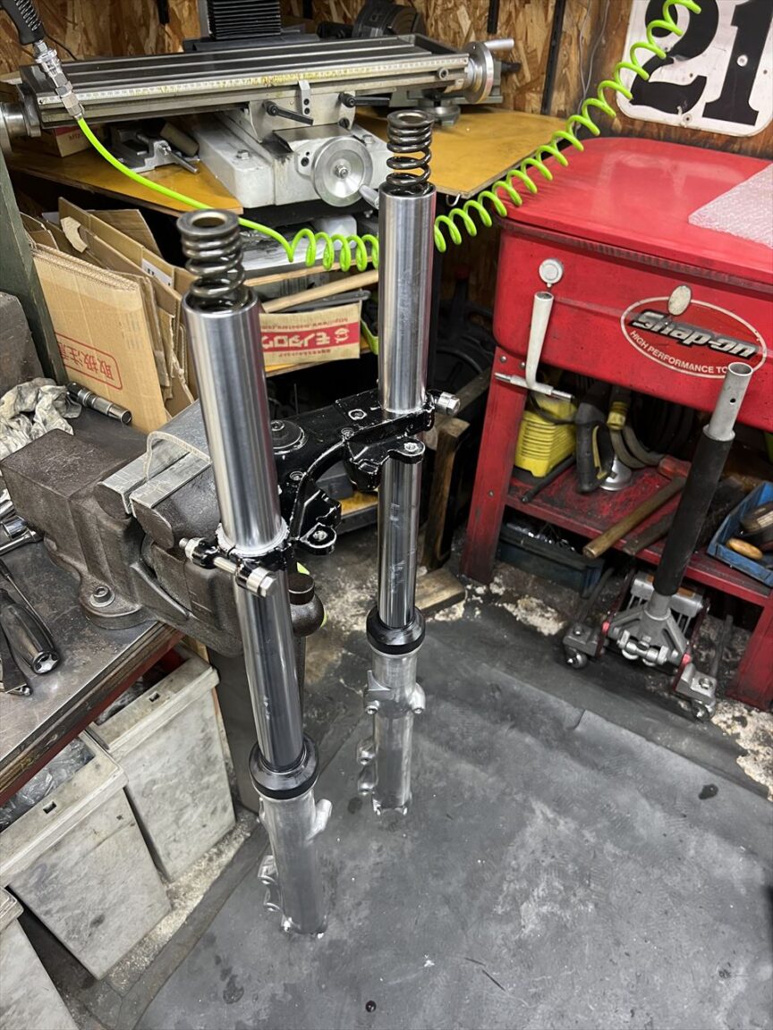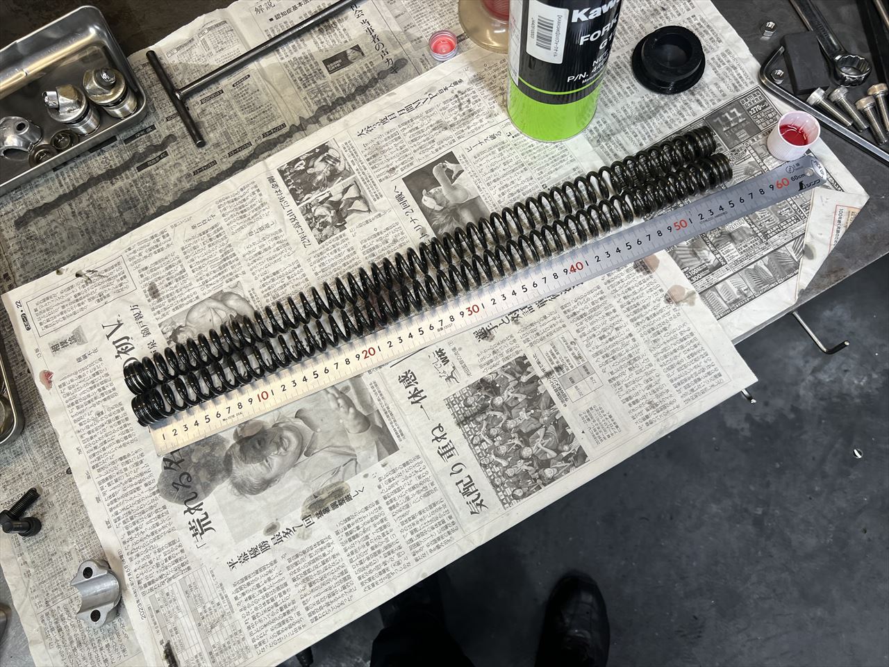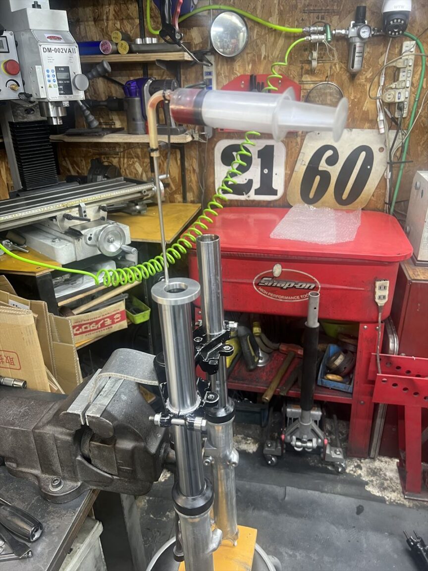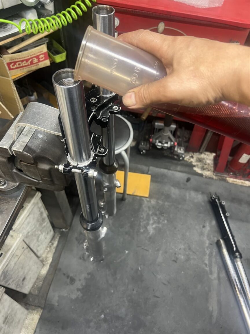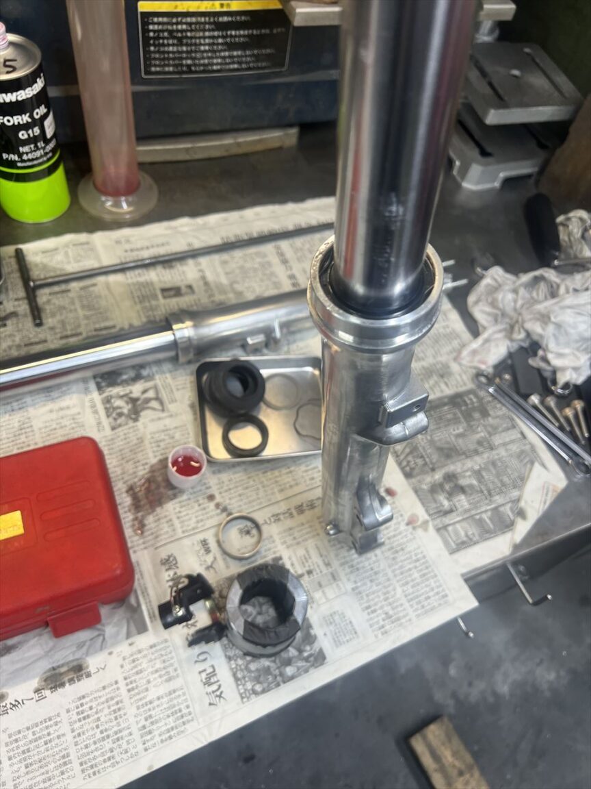 フォークオイルはカワサキのG15を使用。Jの場合は片側約330cc入れます。