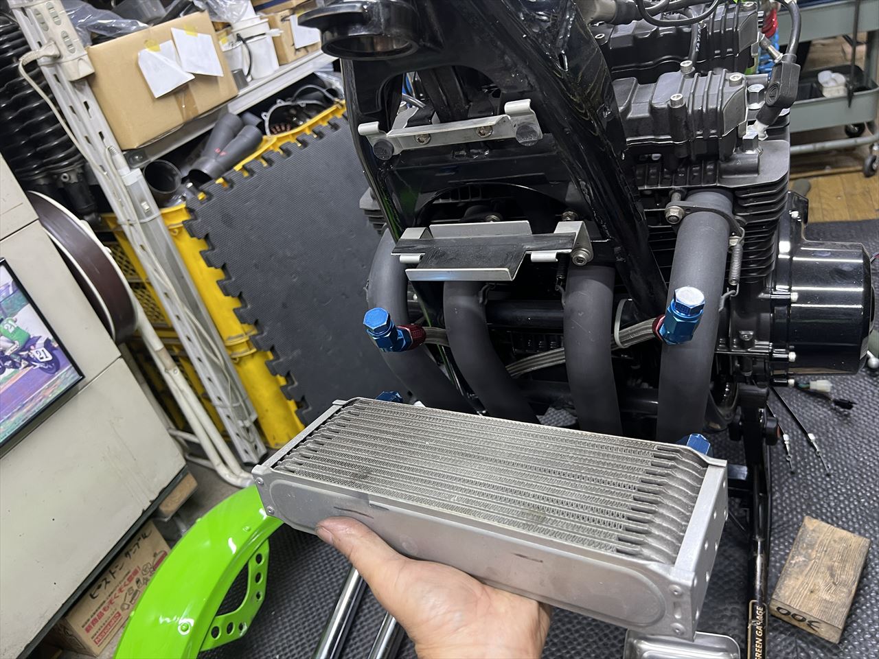 このあとワークスオイルクーラーブラケットをフレームに溶接し、S1ステムを仮付けしてハンドル切れ角をオイルクーラーコアのギリギリに設定し、S1タイプのハンドルストッパーを溶接する作業などに進みます。その際ハンドル切れ角はやや小さくなるので既存のハンドルストッパーとハンドルロックストッパーは削除して作り直します。