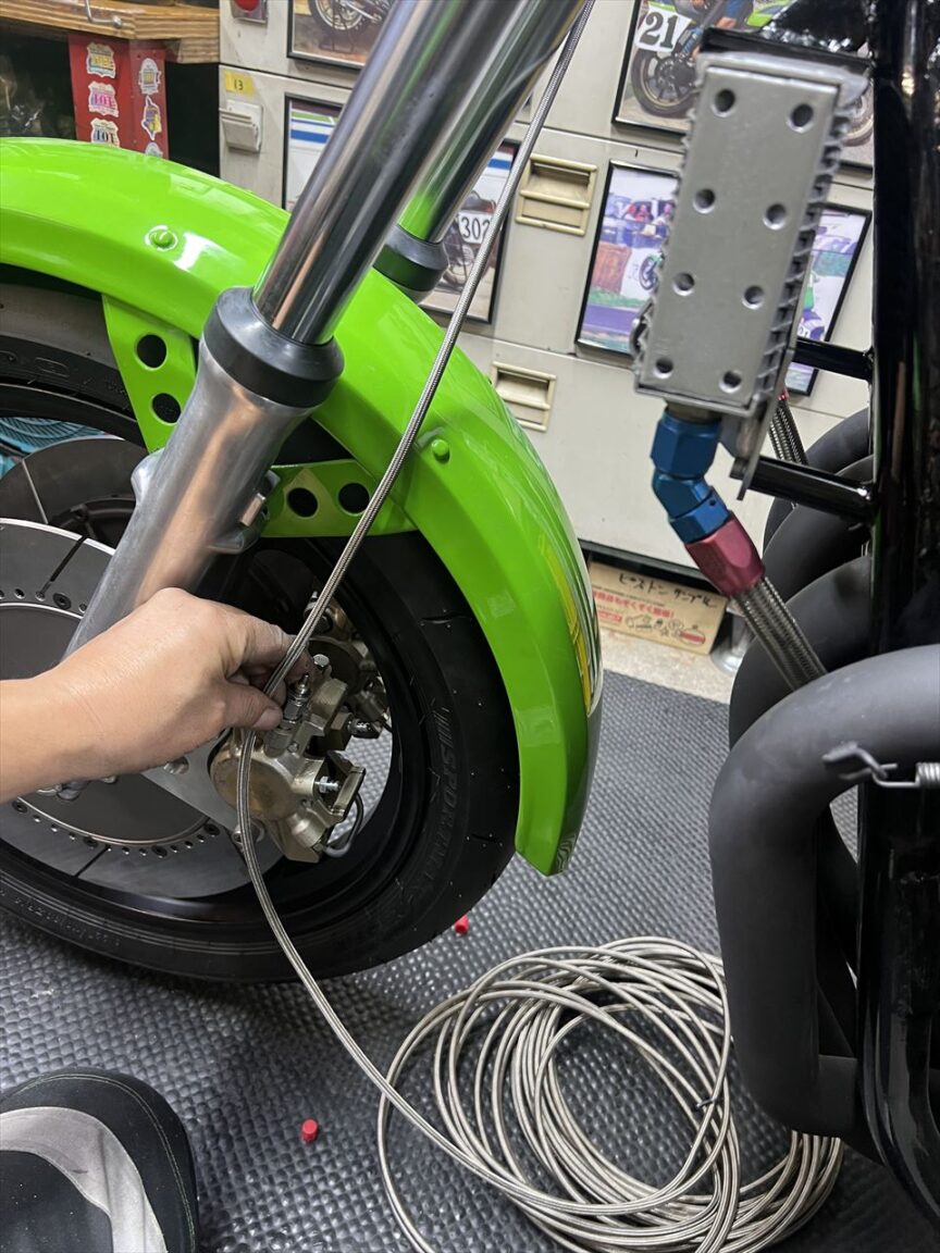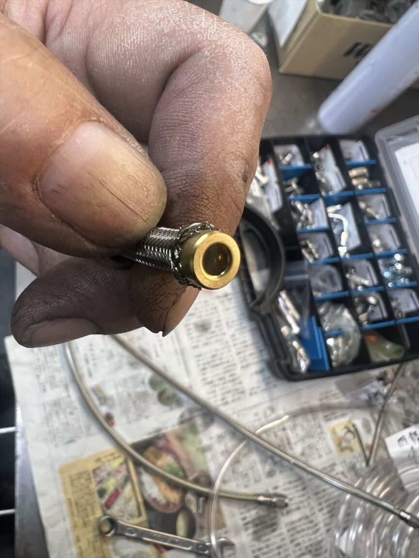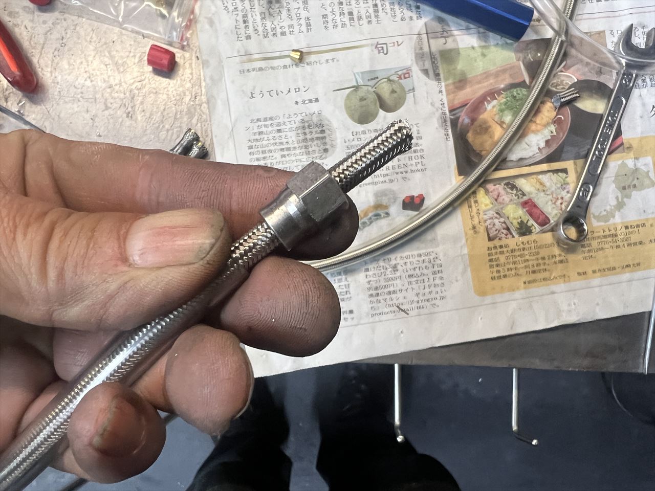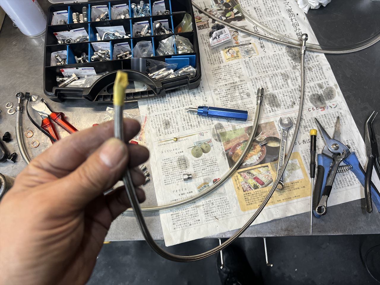 組み立て完了です。この状態でフィッティングとホースの引き抜き強度が20kg以上あるのが正解。キャリパーぐらいぶら下げてもびくともしないようでなければいけません。ですが、ホース長さが足りない状態で作ってしまった場合、急加速などでフロントフォークが伸び切りの状態ではホイールを含めたバネ下重量全てをホースが吊り下げる形になりホースがフィッティングから抜ける原因となります。ホース長さは必ずジャッキアップした状態で決めるのが鉄則です。