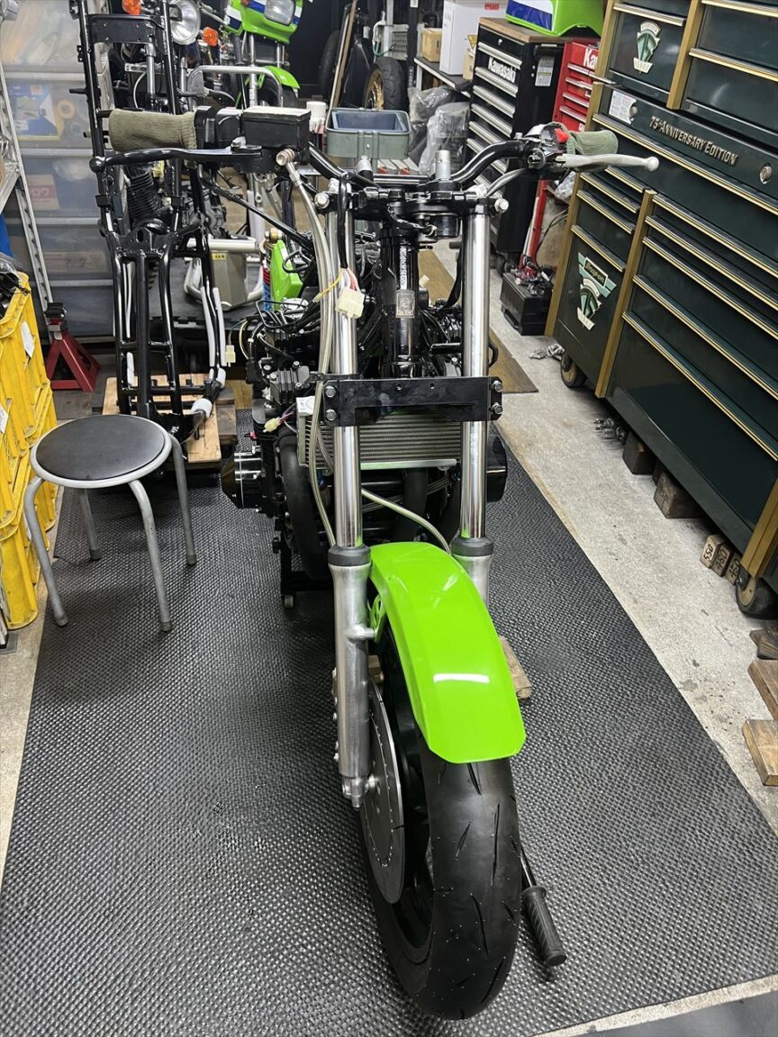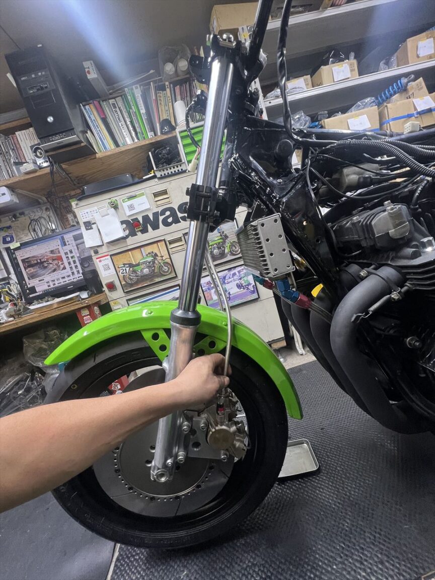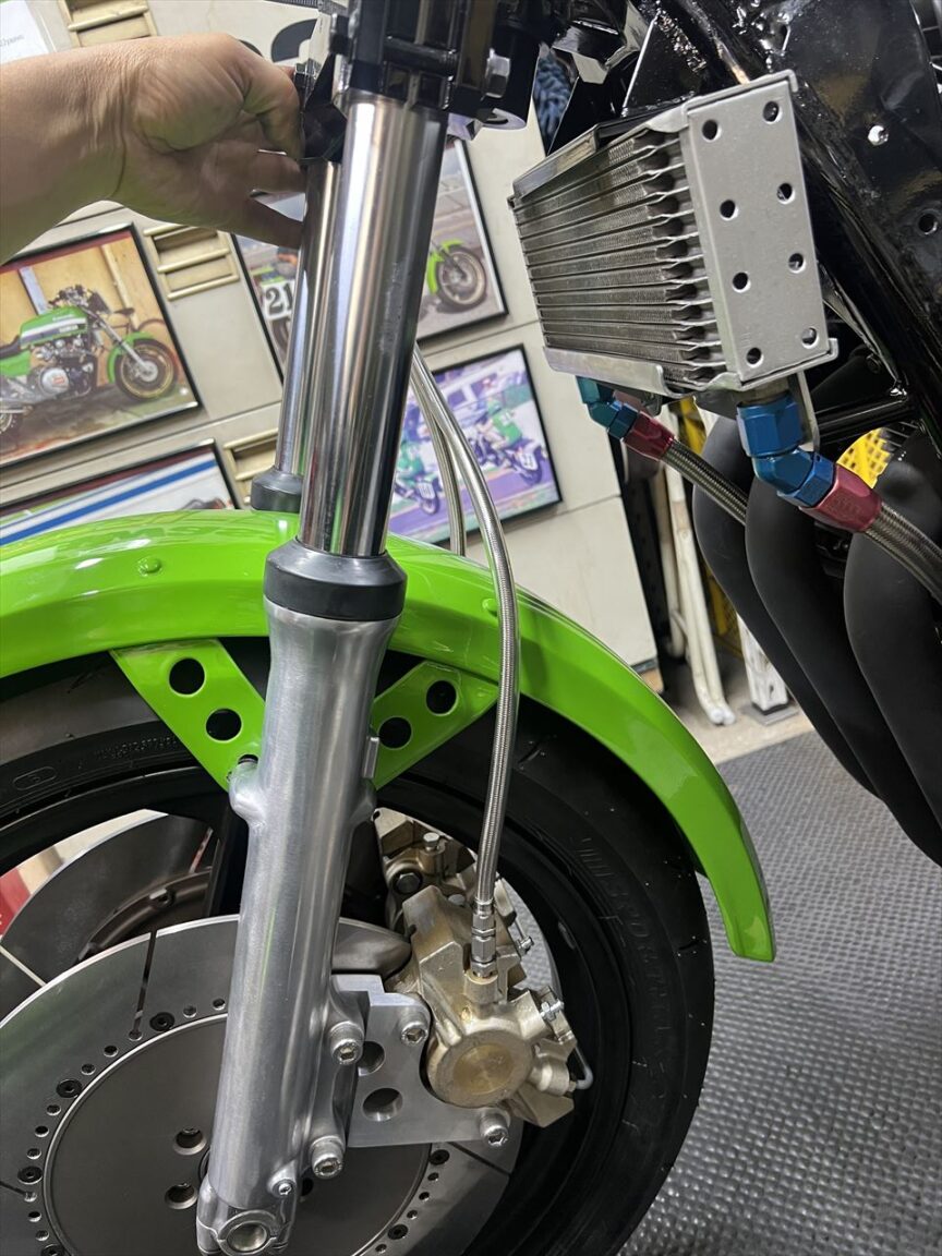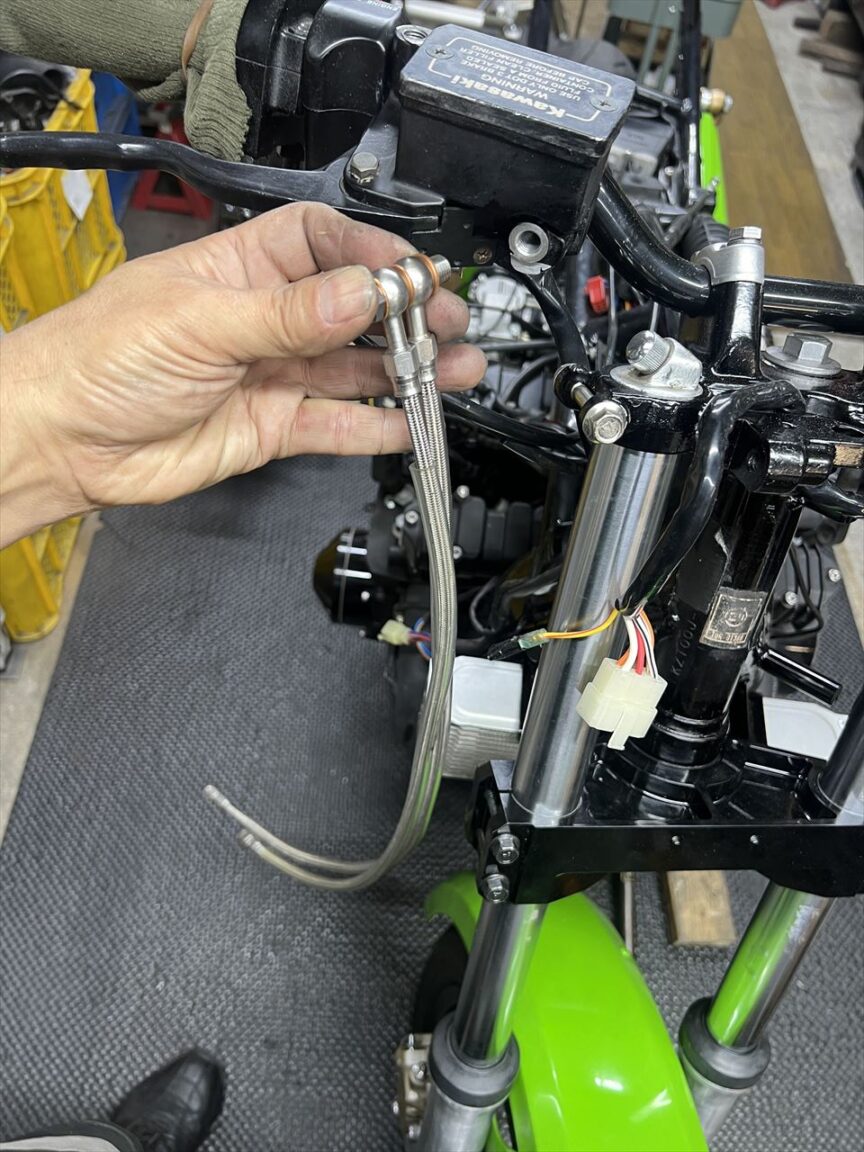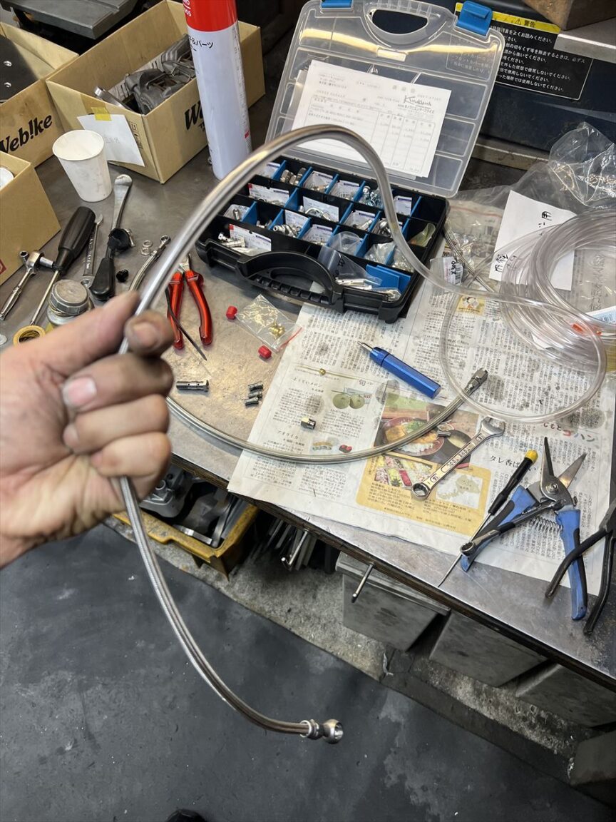 組み立て完了です。この状態でフィッティングとホースの引き抜き強度が20kg以上あるのが正解。キャリパーぐらいぶら下げてもびくともしないようでなければいけません。ですが、ホース長さが足りない状態で作ってしまった場合、急加速などでフロントフォークが伸び切りの状態ではホイールを含めたバネ下重量全てをホースが吊り下げる形になりホースがフィッティングから抜ける原因となります。ホース長さは必ずジャッキアップした状態で決めるのが鉄則です。