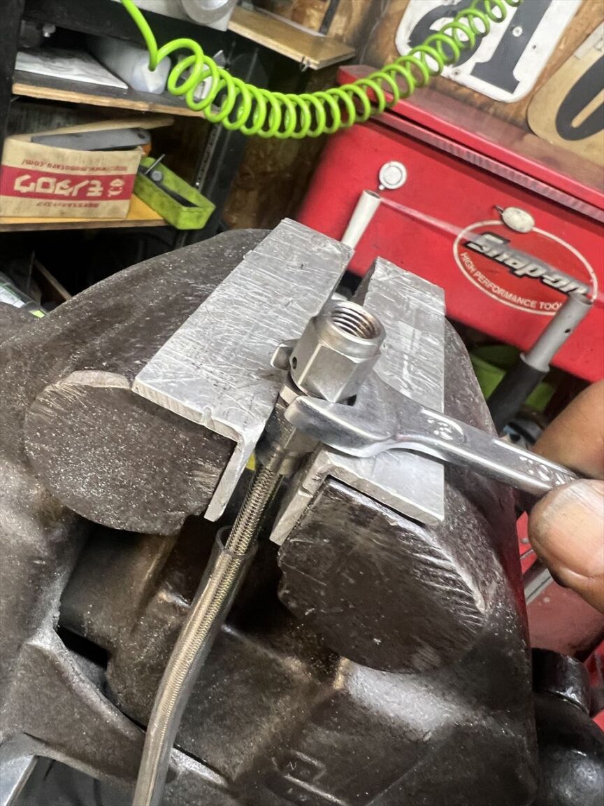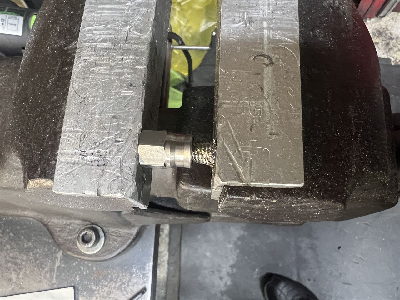 先ず、右側ホースのキャリパー側フィッティングの根元でホースを切断し、バイスに挟んでオリーブで固着したホースを抜き出します。