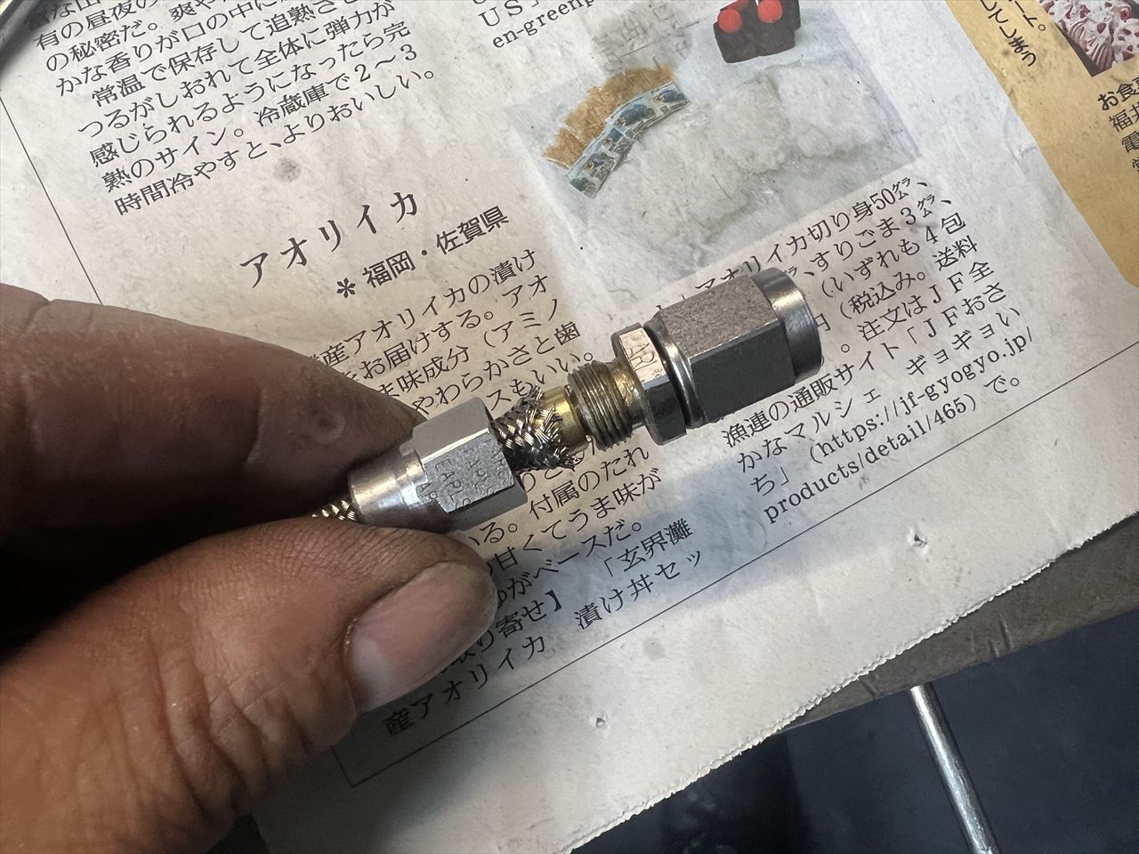 少し短くなったホースに新しいオリーブをセットし、フィッティングを組み立てます。
