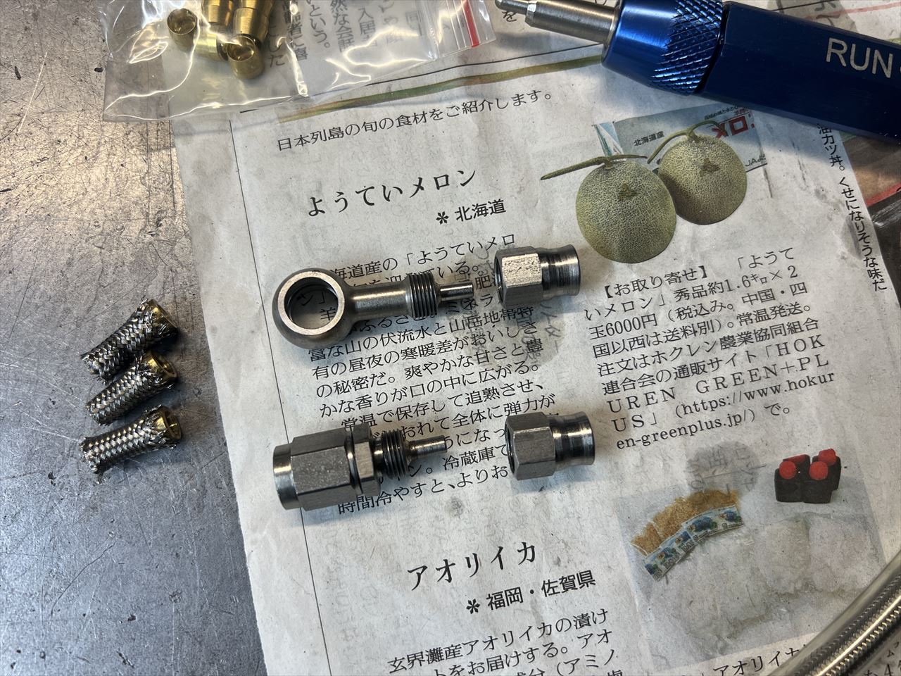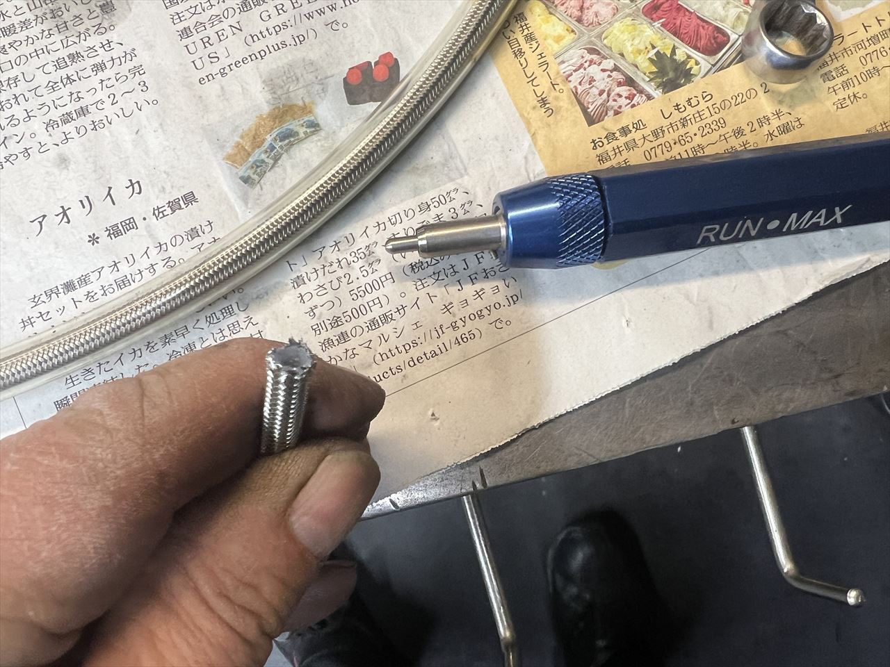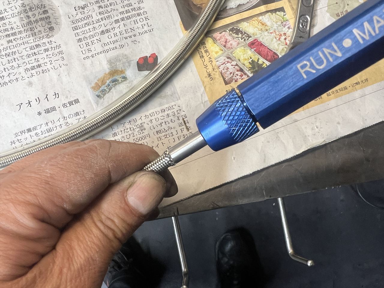 所定のルートを通し、キャリパー側を締め付けます。この際、ねじり角度も一緒に調整し、ねじれが無くホースのたわみがちょうどいい方向になるようにします。