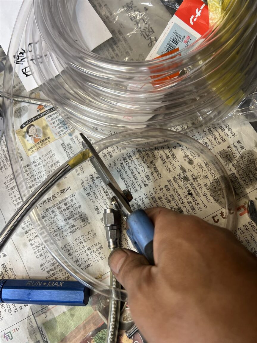 フィッティング組付け時のスペースを考え、ビニールホースは5センチほど短めに。