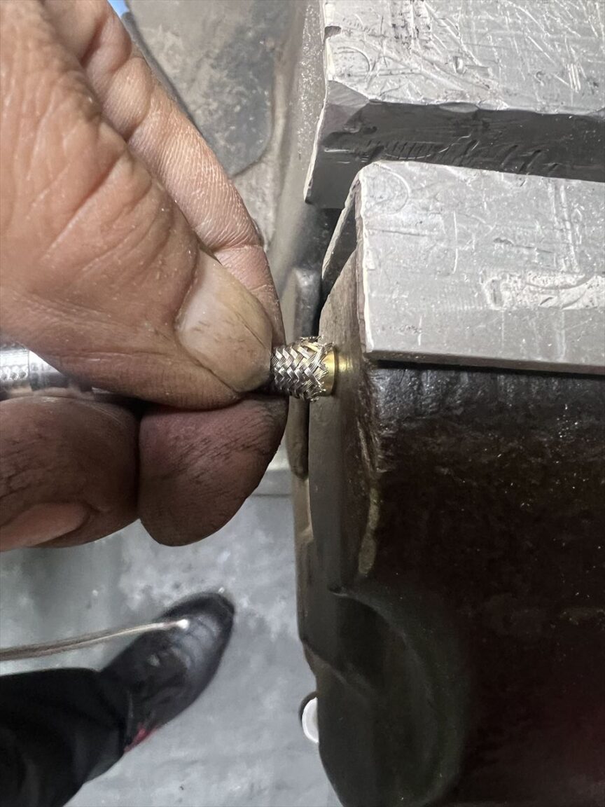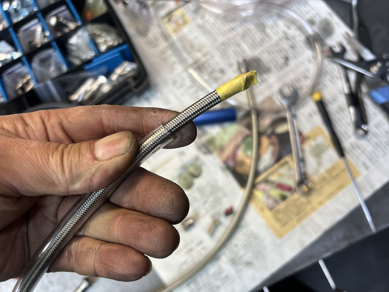 専用工具でステンレスメッシュと内部のテフロンチューブの間に隙間を作ります。