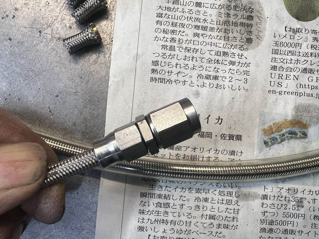 次に左側のホースです。ホースを取り換えるので両端のフィッティングを分解します。