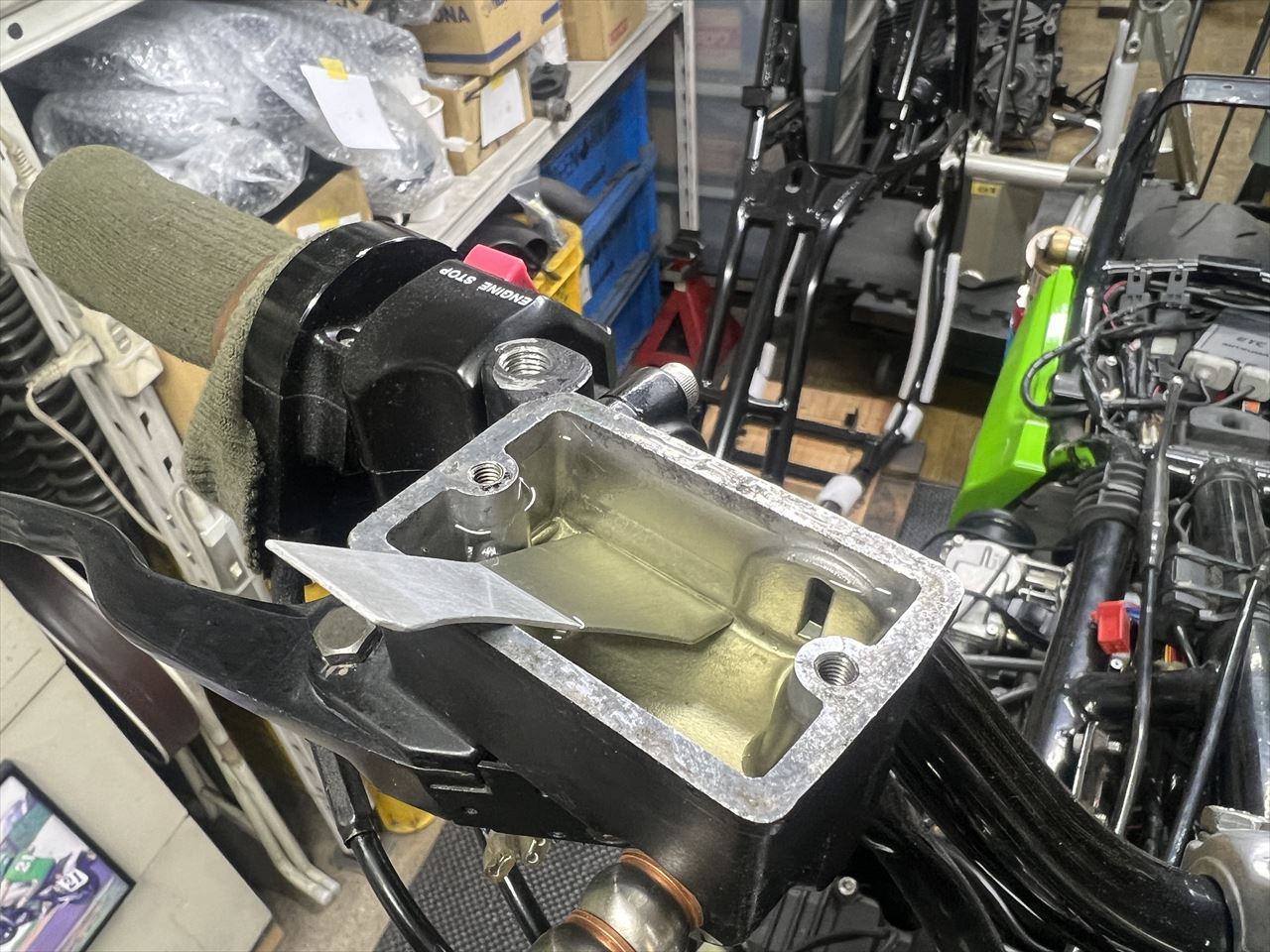 フルードをタンクに入れます。ノーマルマスターの場合、エア抜き時にレバーを握ると小さい方のポートから噴水のようにフルードが噴出しこぼれます。それを防止するためアルミ片などを入れておくとこぼれにくくなります。