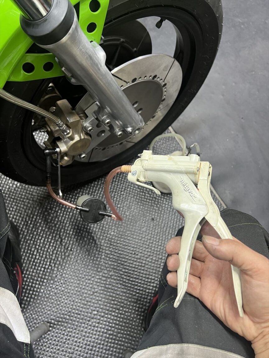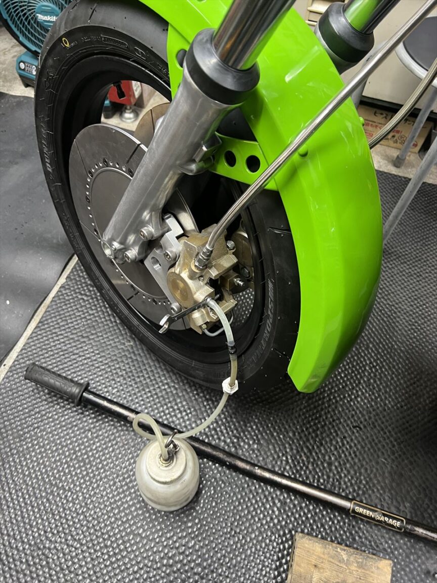 左右ともキャリパーまでフルードを通したら、次に車載のままできるだけエア抜きします。