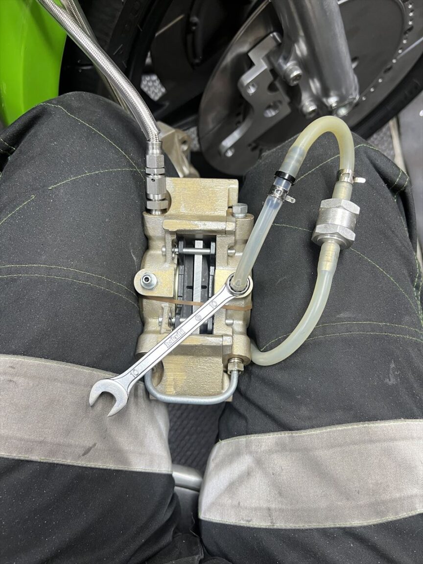 大方のエアが抜けたらキャリパーを外し、ローターの代りにアルミ板を挟んでブリーダーを上にしてしつこくエア抜きします。