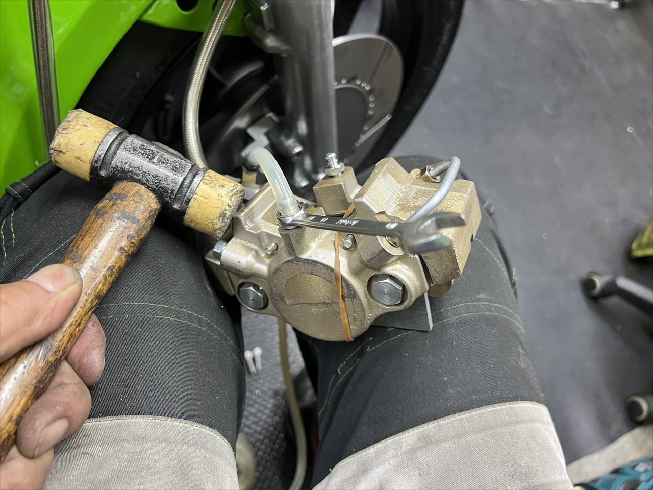 S1キャリパーはこのブラインドプラグのところにエアが残りやすいので、ここのエアを出すつもりで向きを変えてプラハンで少し叩きます。