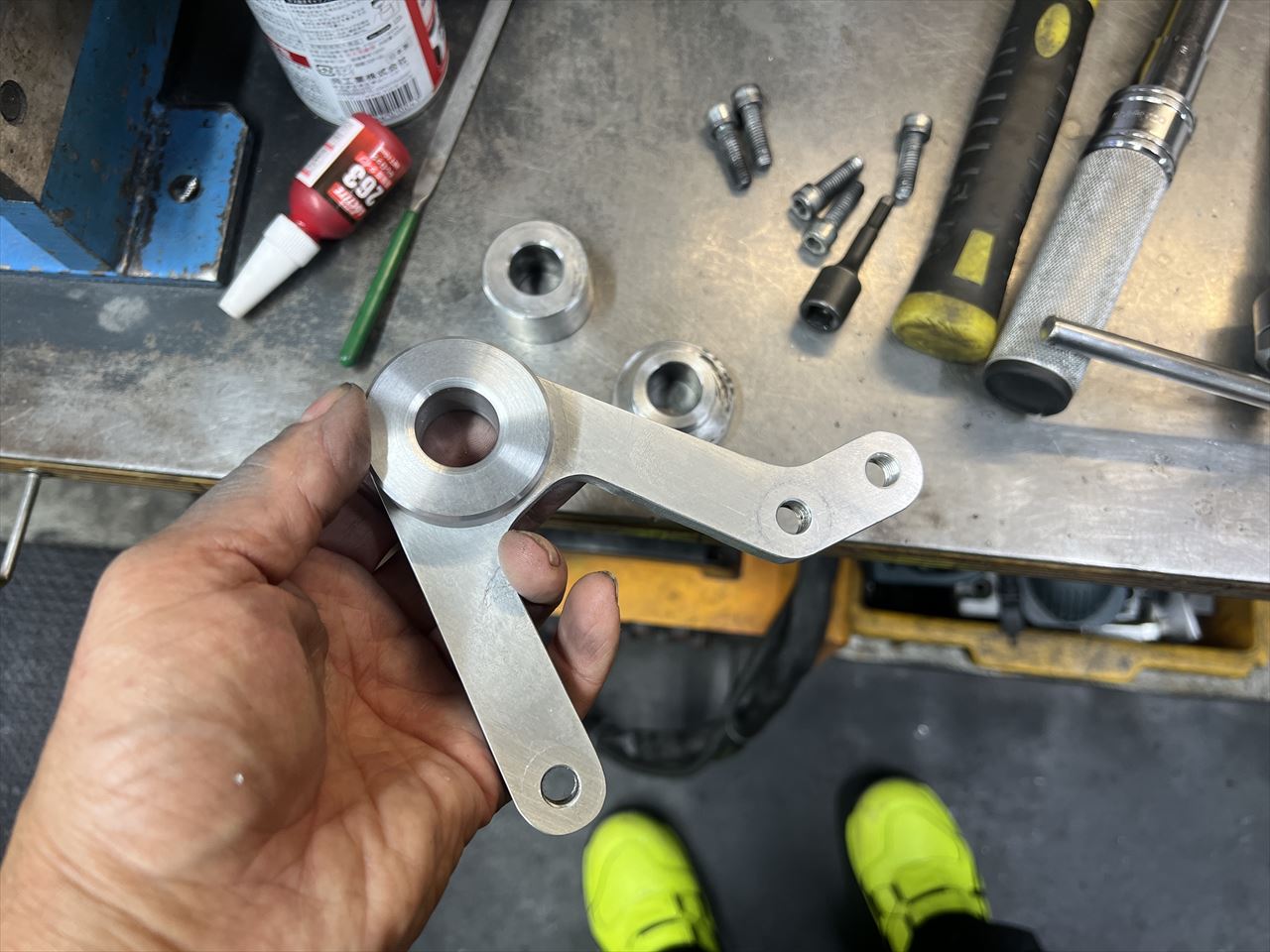 続いてチェーンガイドローラーのブラケットを製作します。現在はローラーブラケットが別体となっていますが、今回はステッププレートと一体化したものを製作します。