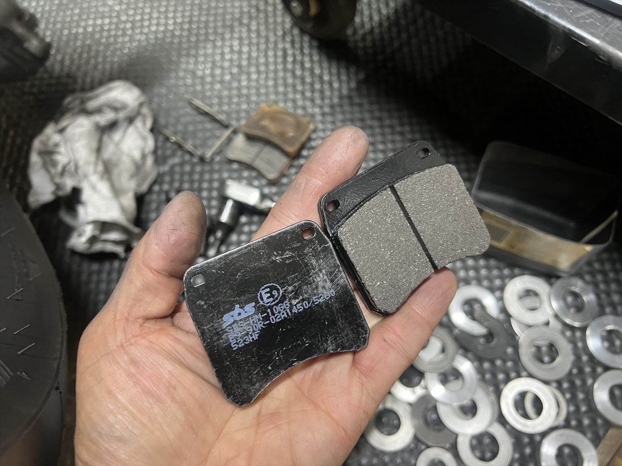 新しいローターになるので、パッドはローターへの攻撃性が低い柔らかい材質のものに変更します。