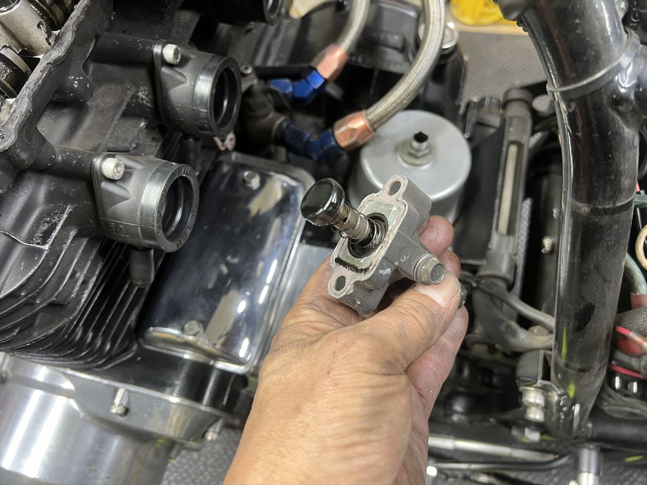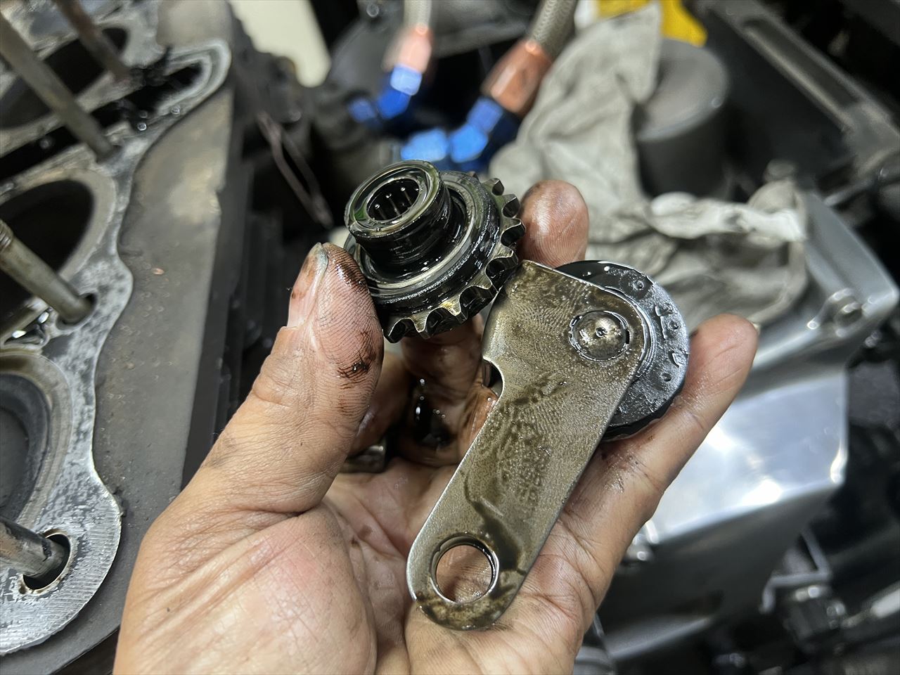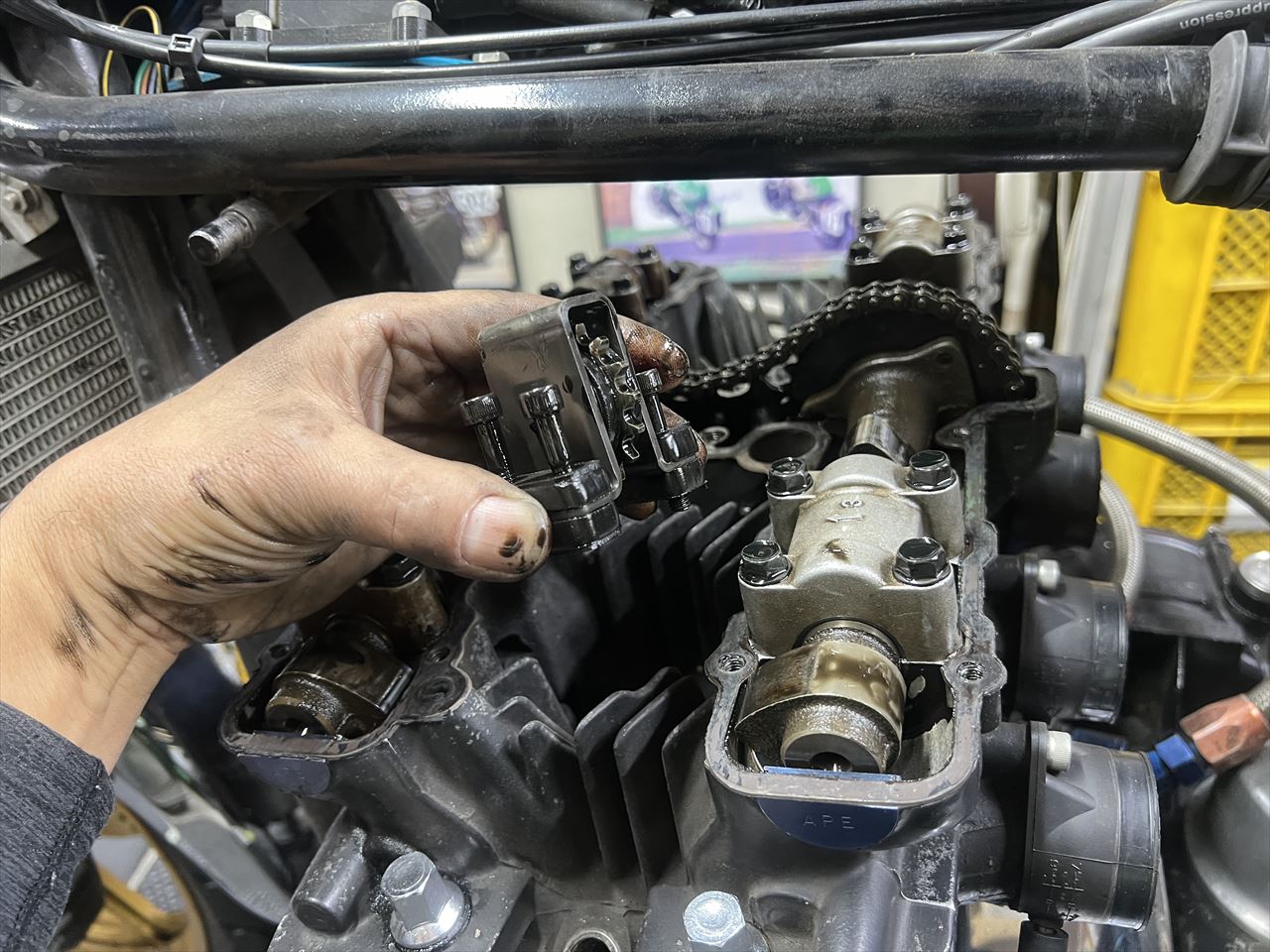 カムチェーンテンショナーを外します。こちらは純正ですね。クランクの正逆転でバックラッシュが無かったので、このテンショナーは継続使用可能でしょう。