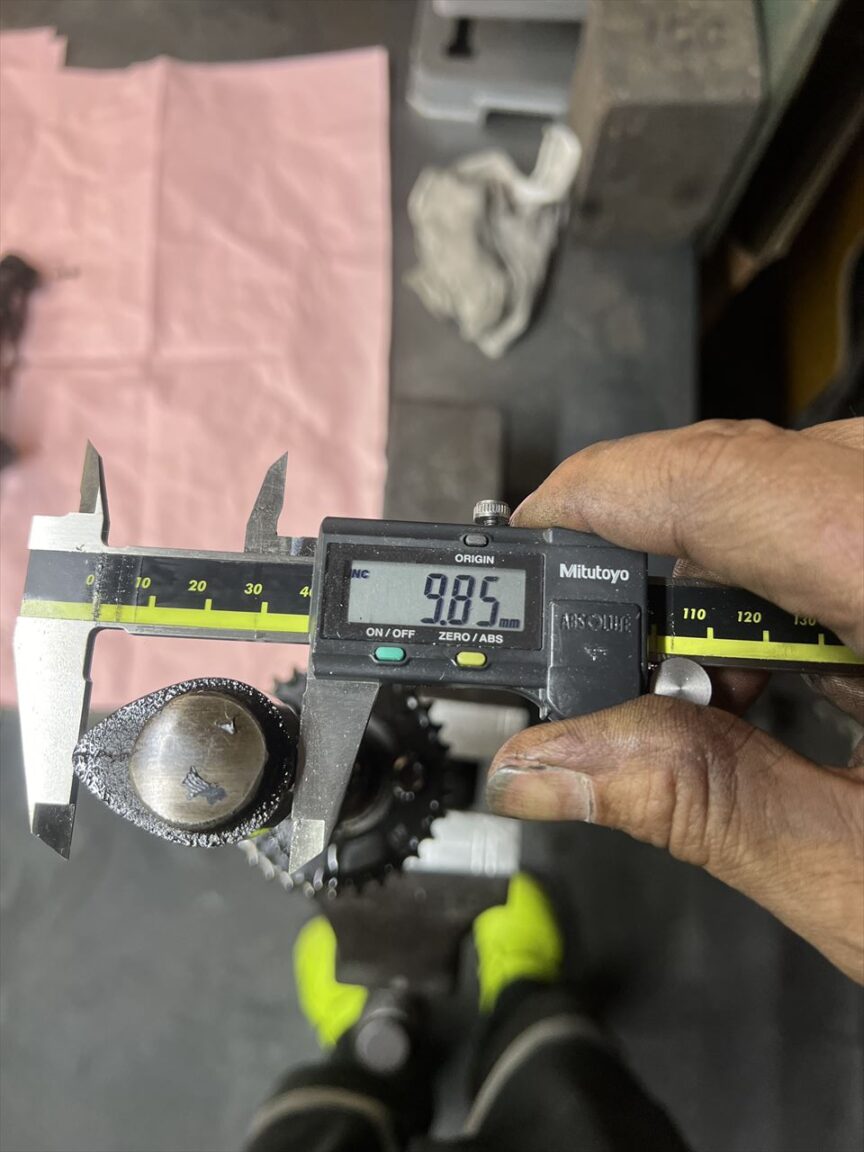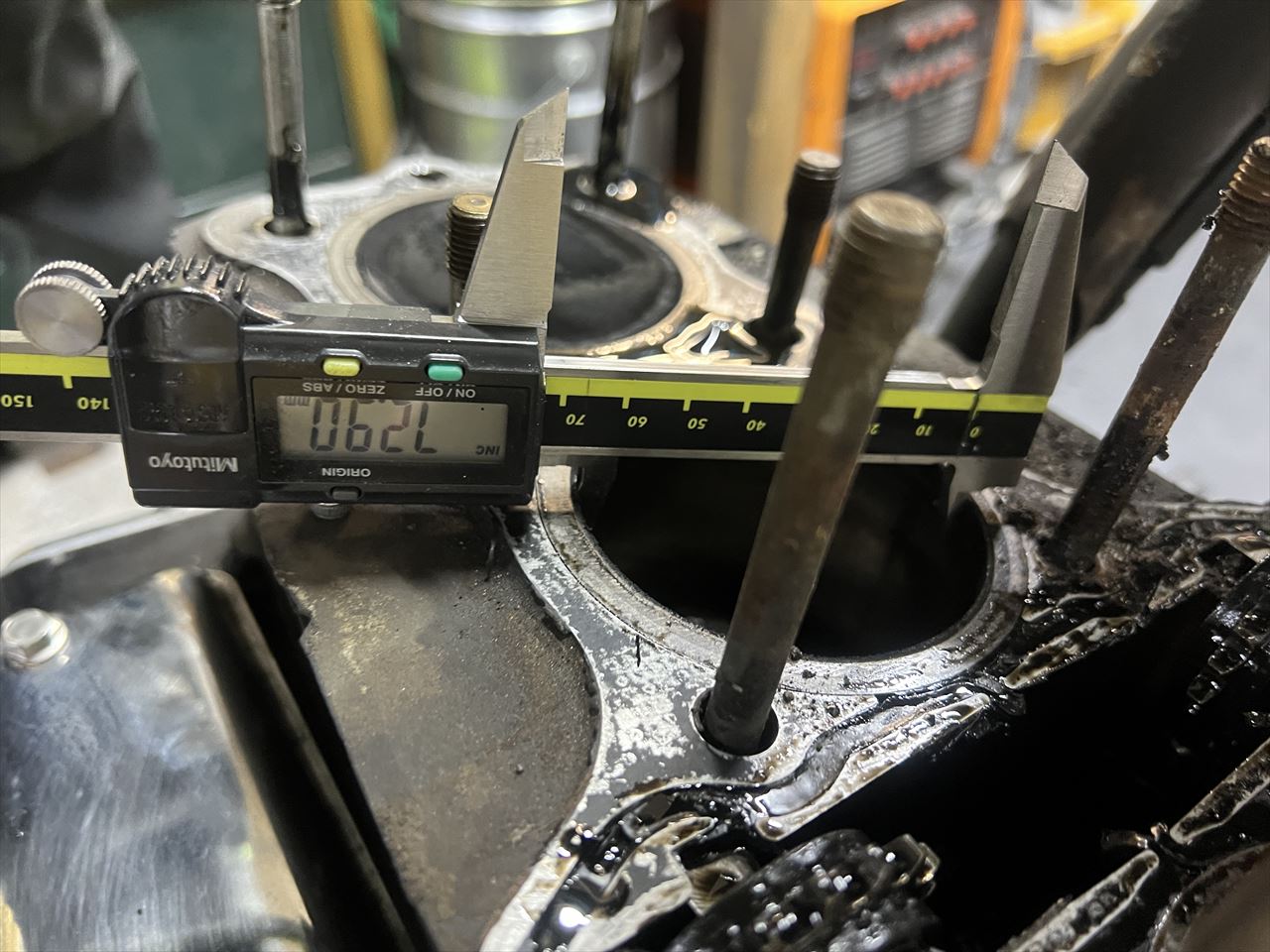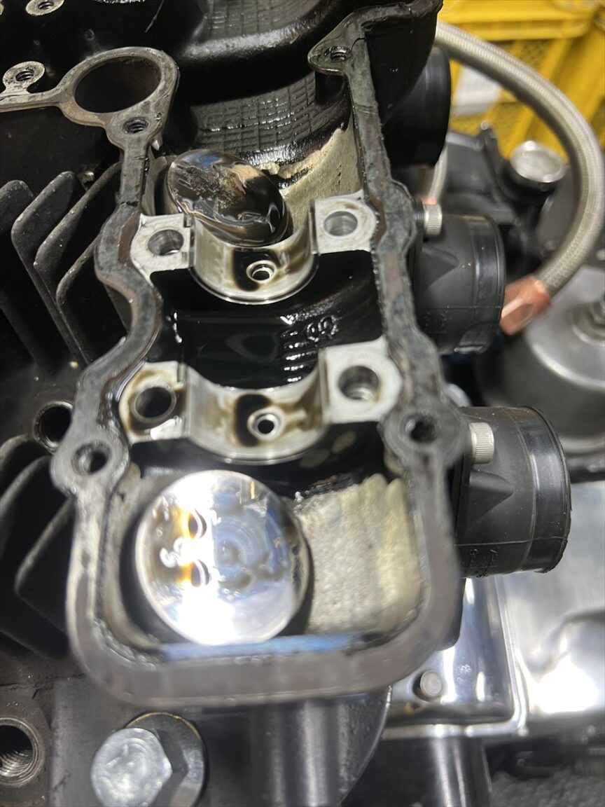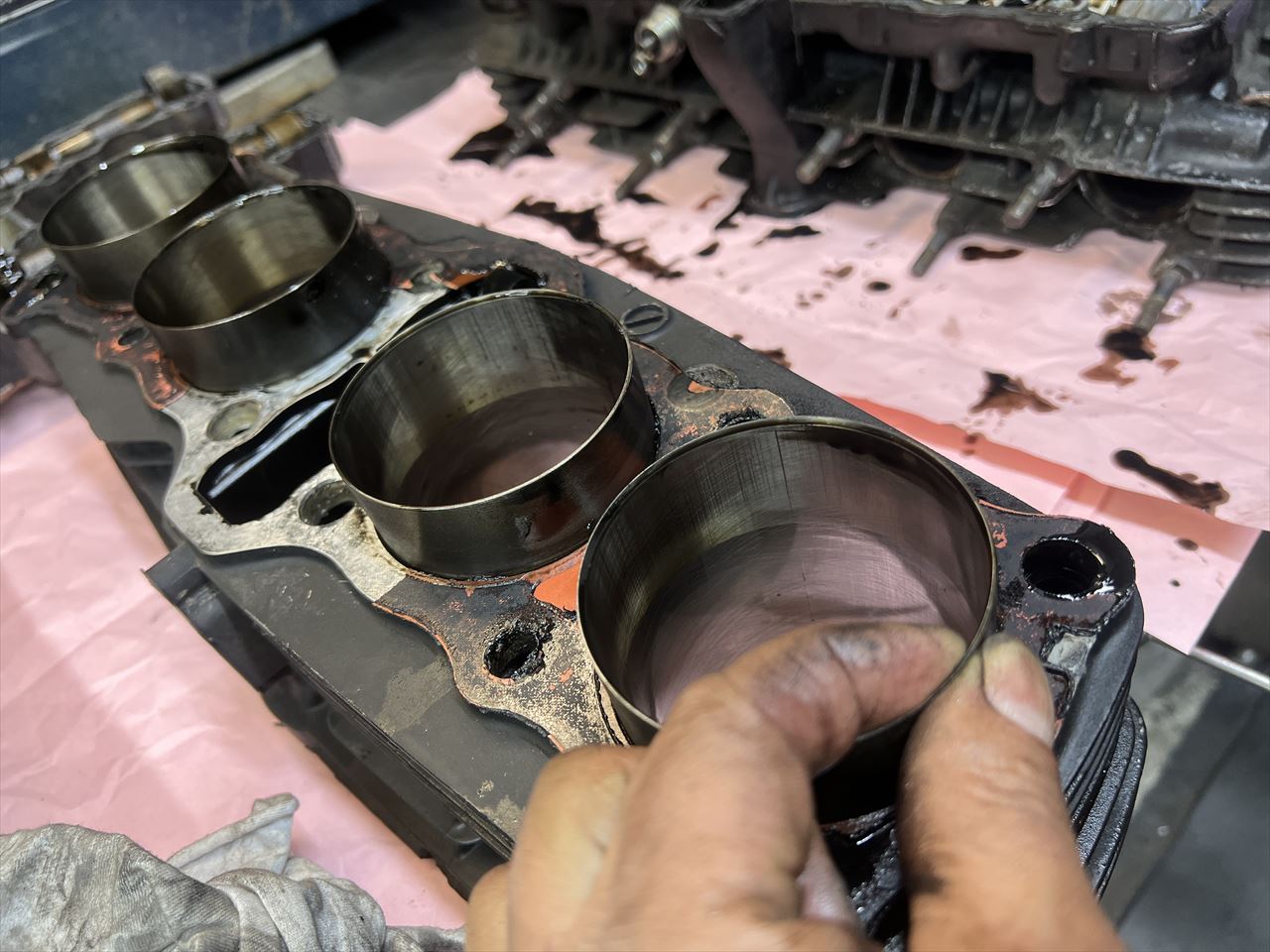 シリンダーはノーマルスリーブをボーリングして使用しているようで、残厚は2ミリ以下とかなり薄目。今回はスリーブ交換して排気量は再設定となりそうです。