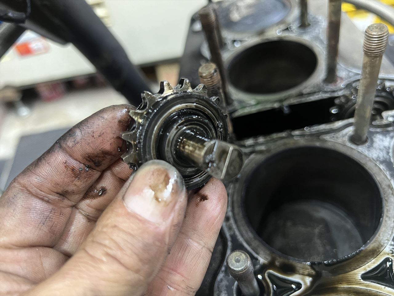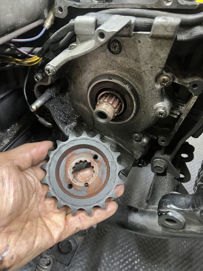 フロントスプロケを外します。アウトプットシャフトのスプラインの摩耗が進んでいたのはチェック済み。今回新品のアウトプットシャフトに交換する予定です。