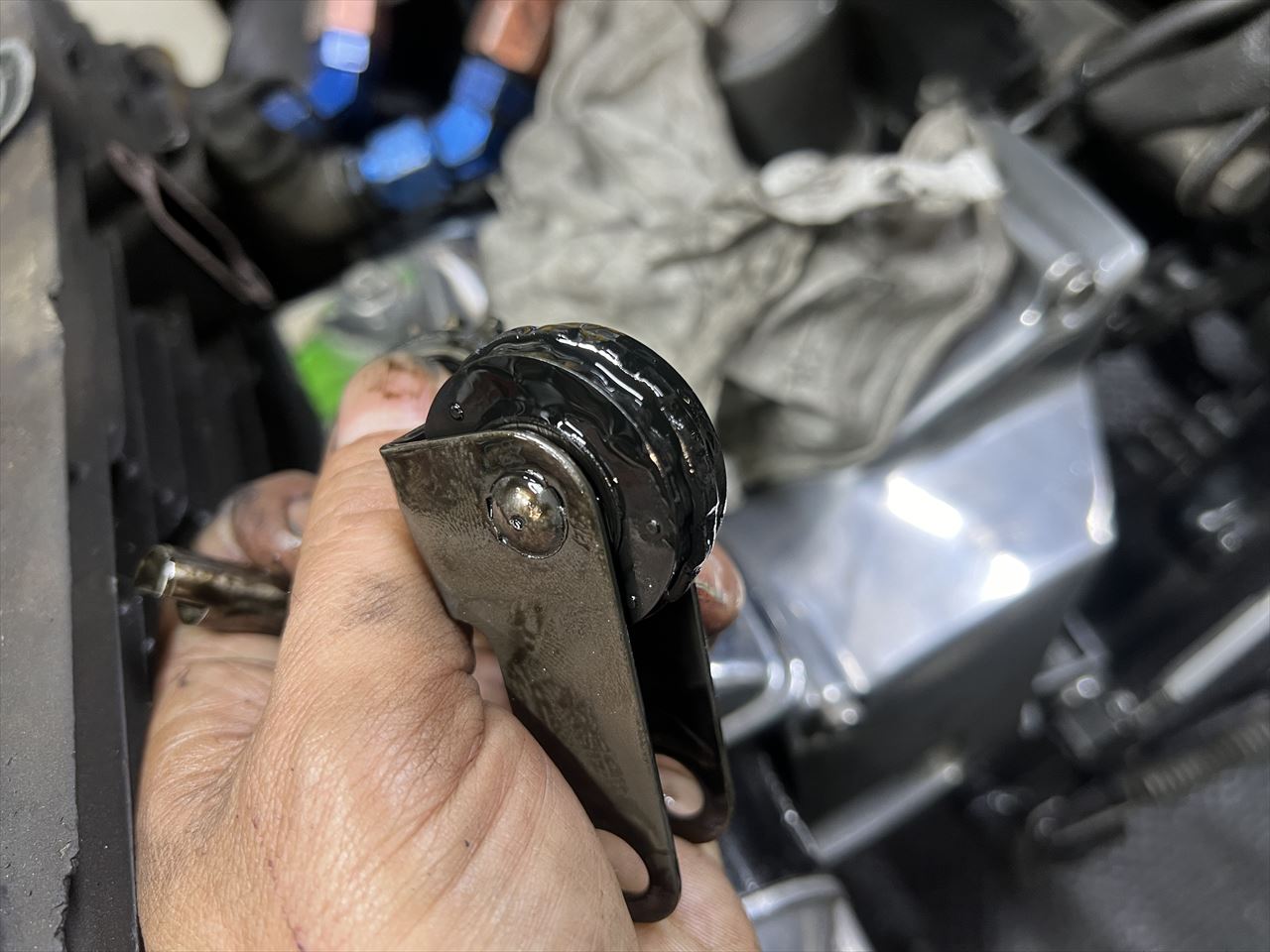 トップアイドラーを外します。Mk2純正と違う形状ですね。Z1系の形状です。ローラーはダンパー部分と剥離してガタが出ています。こちらはもともと交換予定です。