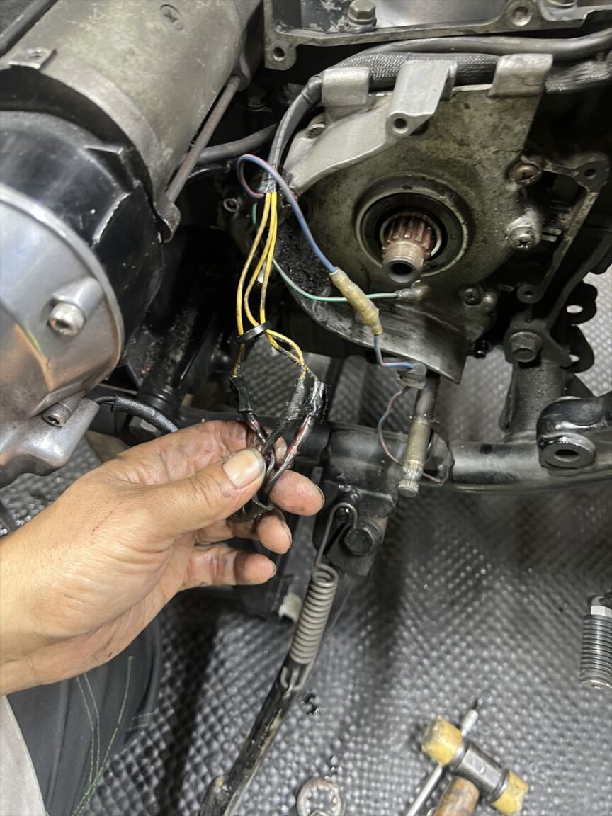 ジェネレーター配線のギボシはかなり焼けて外せません。切断して新しいギボシに交換します。