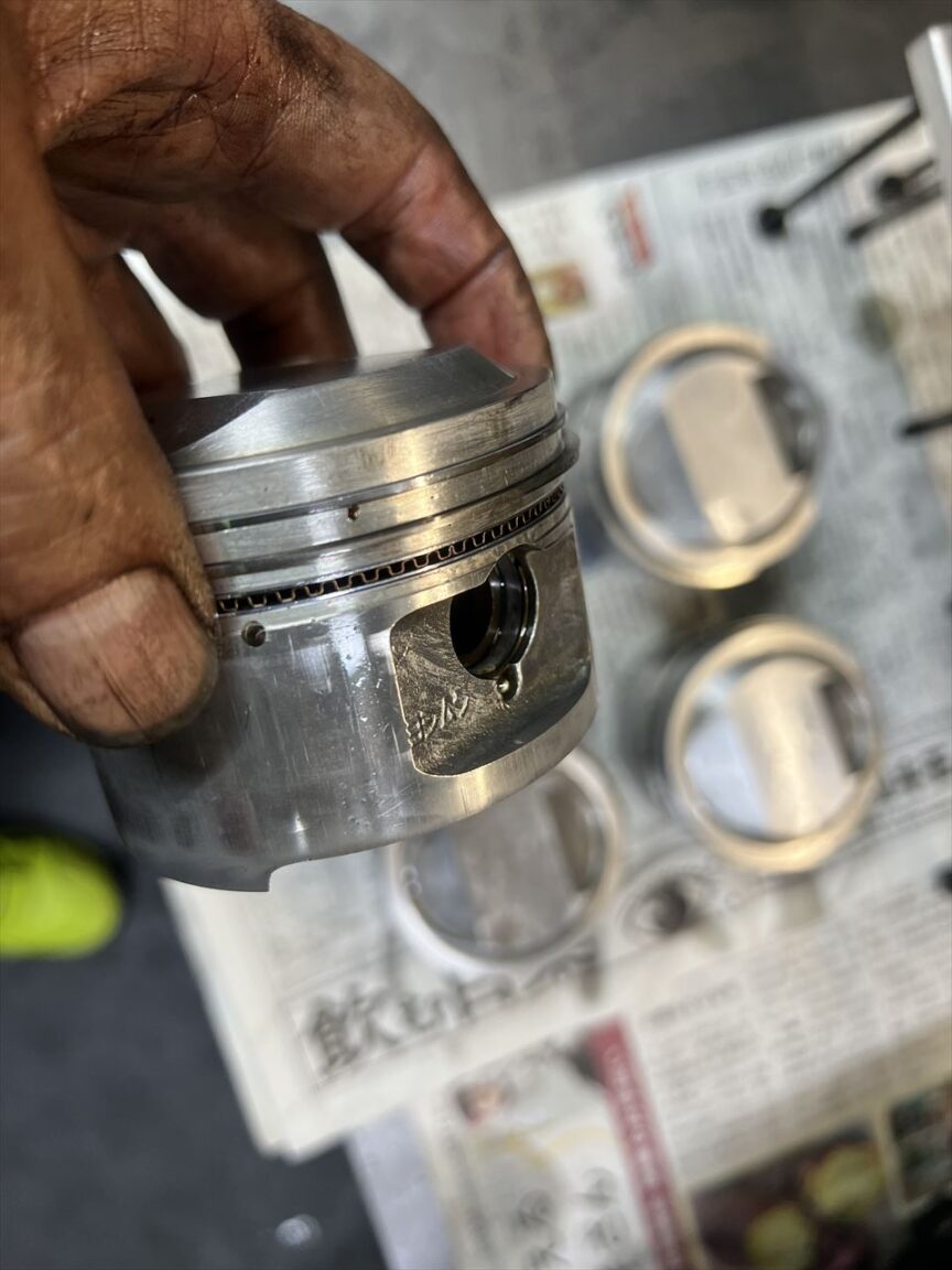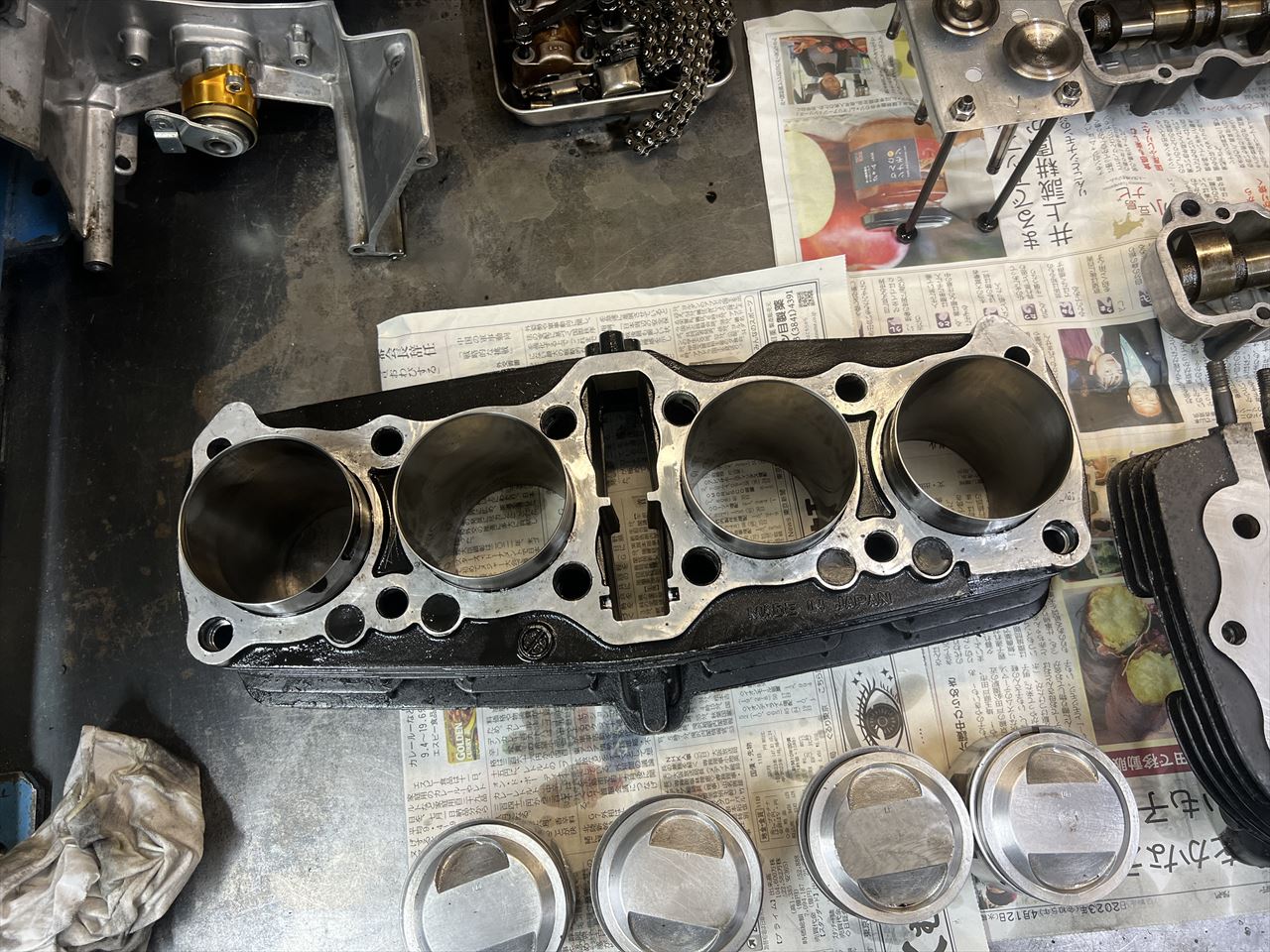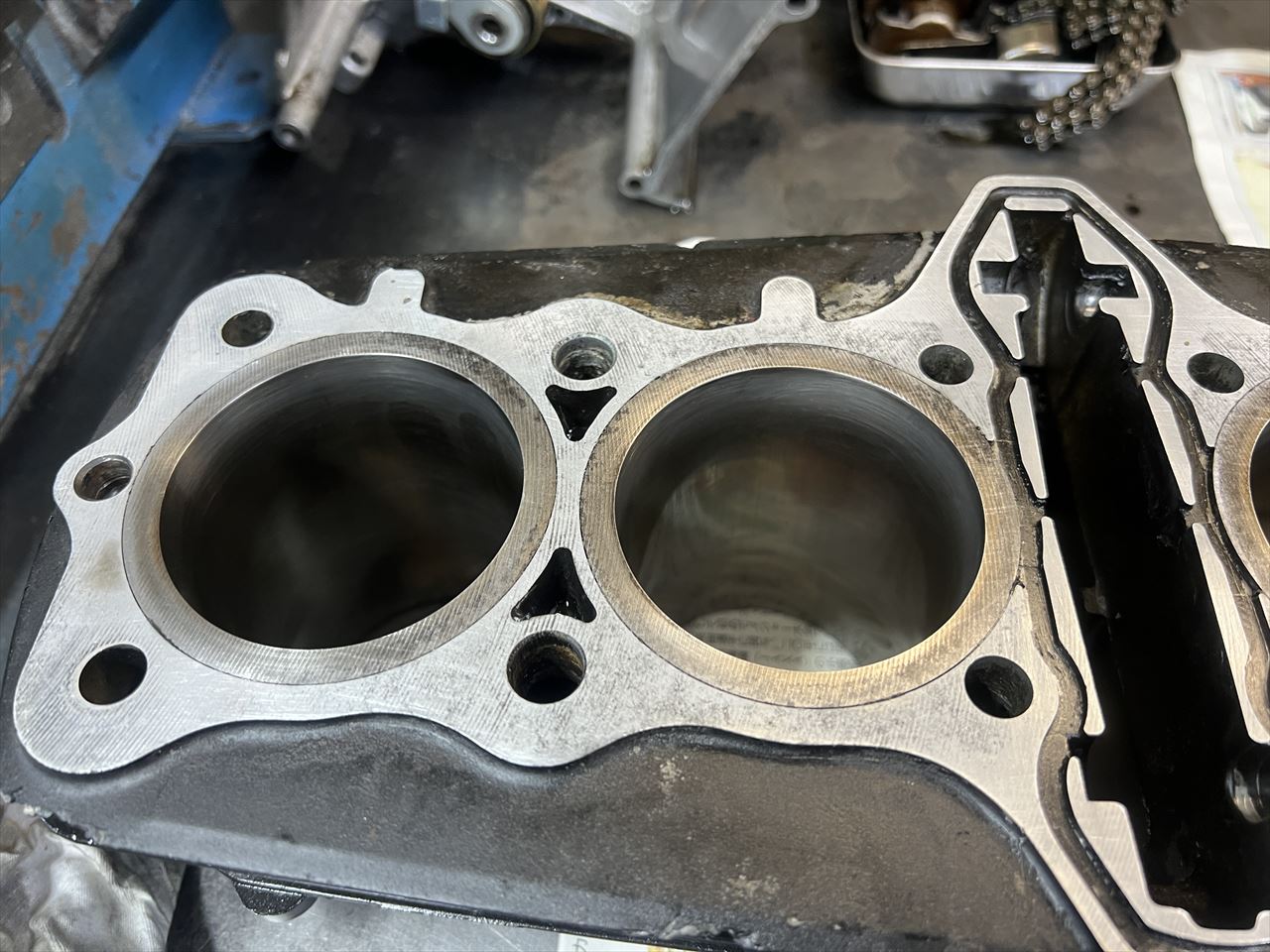 シリンダーはノーマルスリーブをφ73ミリまでボアアップしたもののようで、肉厚が2ミリ以下とやや薄め。それ以外はクロスハッチも結構残っており、スカッフもほとんど無いのでまだ十分使えそうです。